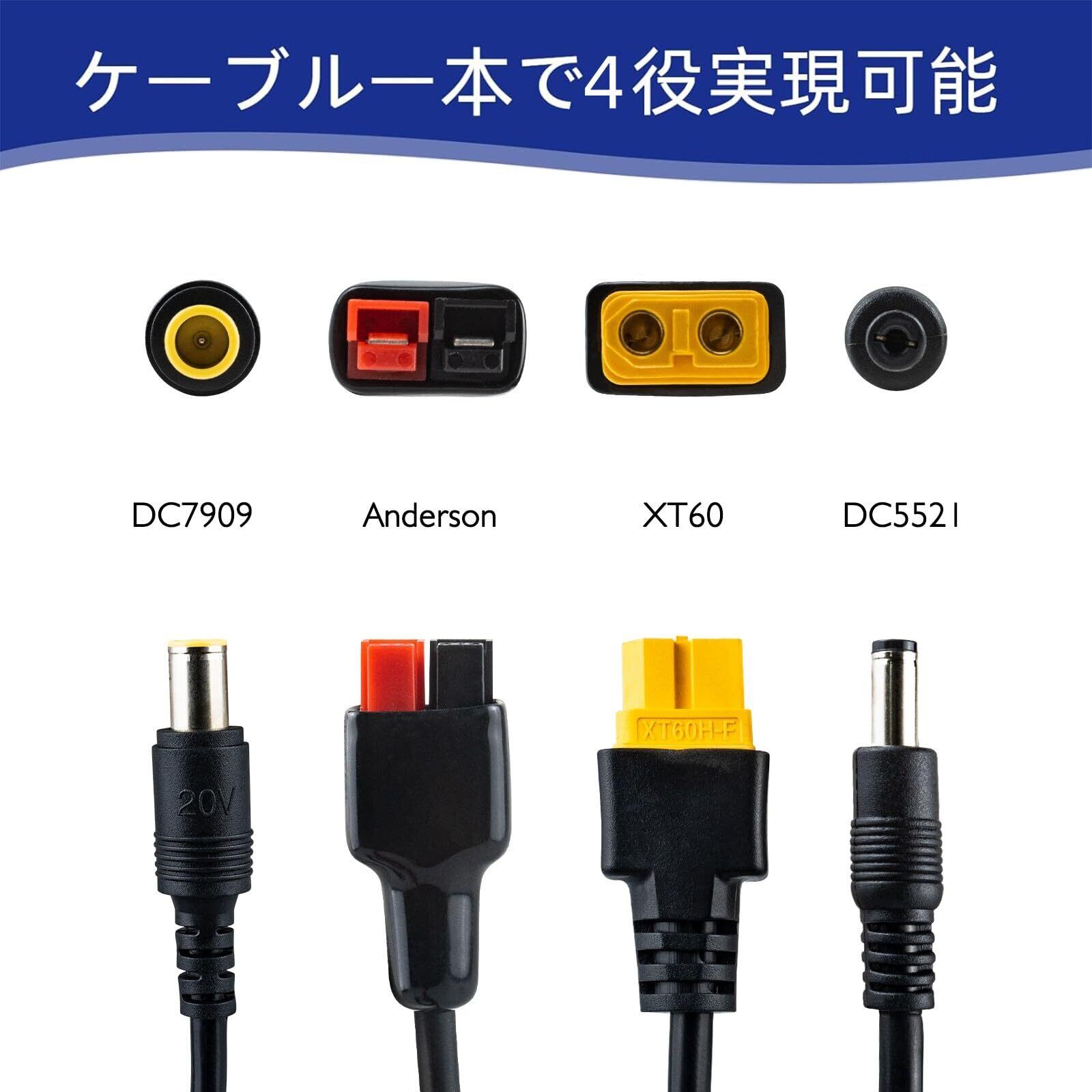 【製品仕様】総線長:1M。ケーブル材質:純銅メッキ。メイン:12AWG、サブワイヤ:16AWG。PVC絶縁材質&外皮材質。動作温度:-20°C-120°C。定格電圧:300V。定格電流:10A-30A。難燃レベル:UL94。防水レベル:IP67。出力コネクタ:DC7909、DC5521、アンダーソン、XT60。大部分のポータブル電源に充電することが可能です。
