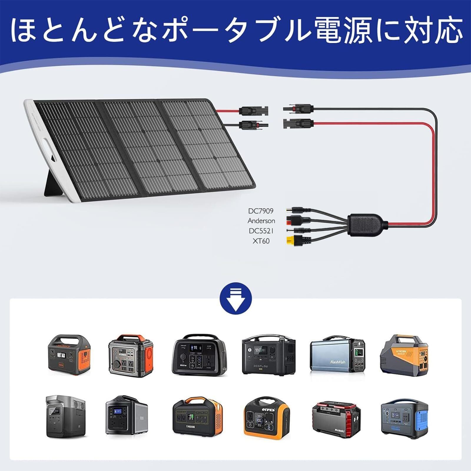 【幅広い用途】ほぼすべてのブランドの50W/100W/175W/200W/300W/400Wソーラーパネルと完全に互換性があります。ポータブル電源や家庭用RVの充電に最適です。ソーラー発電機、ポータブルバッテリー(Jackery、BLUETTI、EcoFlow、NECESPOW等)、ソーラー発電所、ソーラーバッテリーパック、電気自動車、UPSバッテリー、蓄電池、ゴルフカート、フォークリフトで広く使用されています。