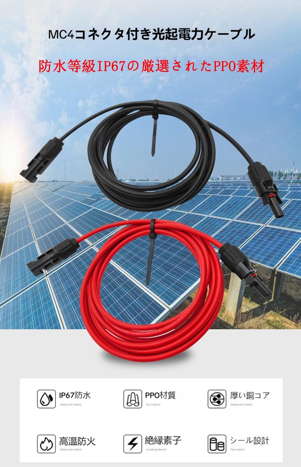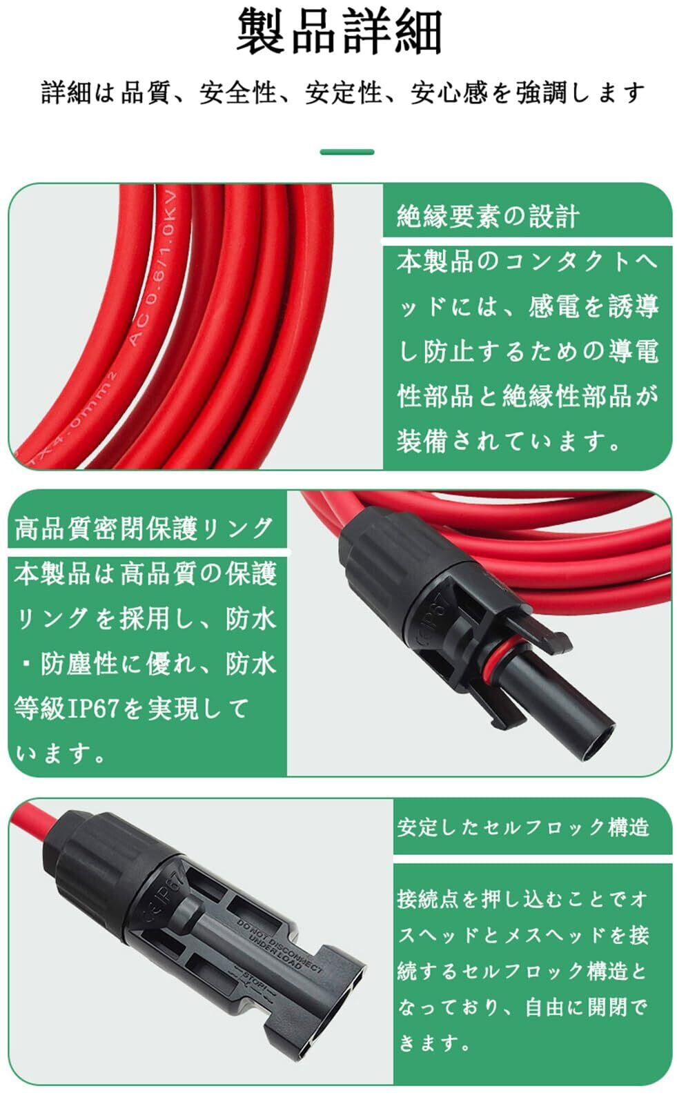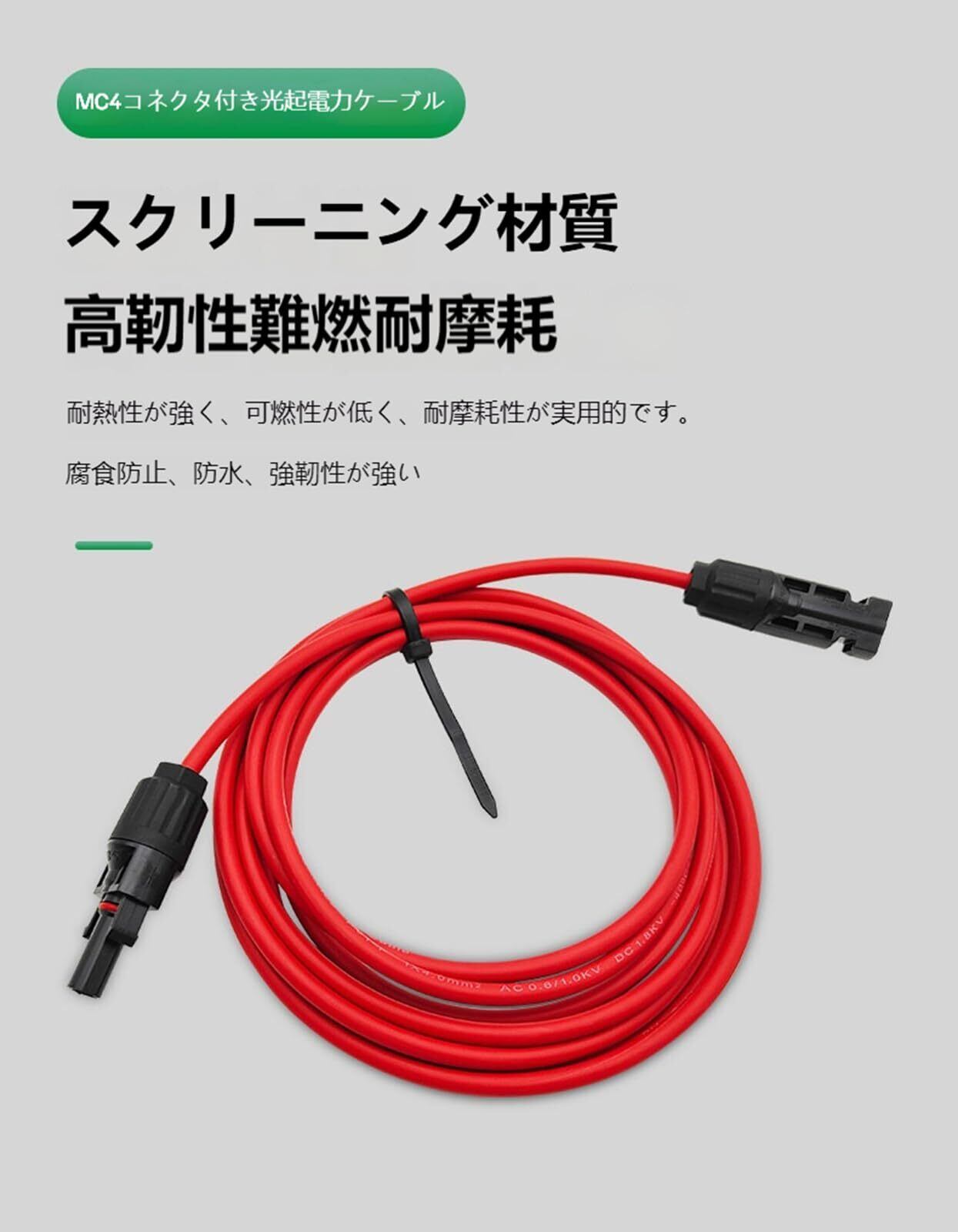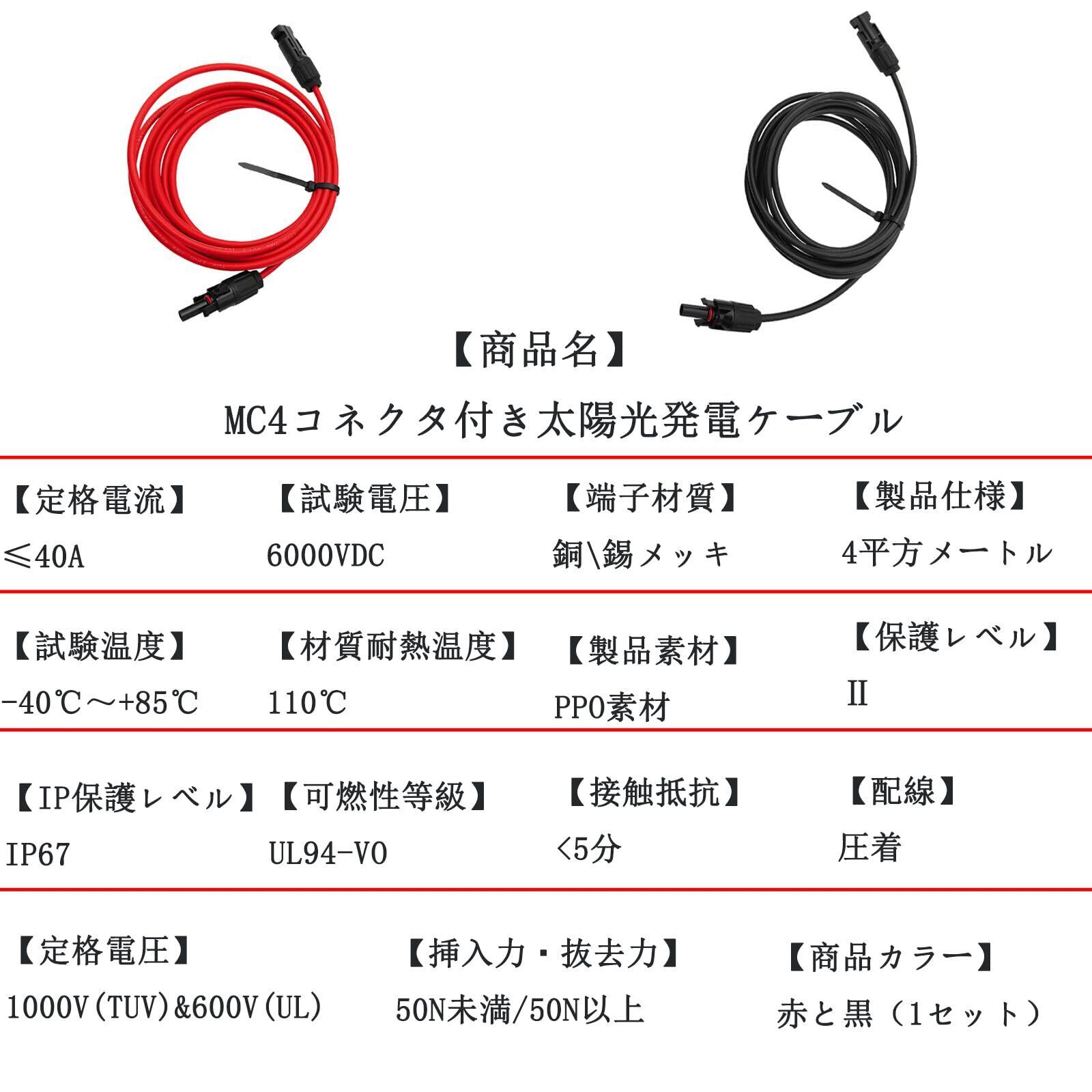 【仕様】規格:12AWG、断面積:4mm²/6mm²(長さ:1M 2M 3M 5M 10M ) 定格電圧:DC1000-600V、許容電流:40A、端子タイプ:MC4コネクタ(両端加工式)(赤い延長ケーブル*1本+黒い延長ケーブル*1本)