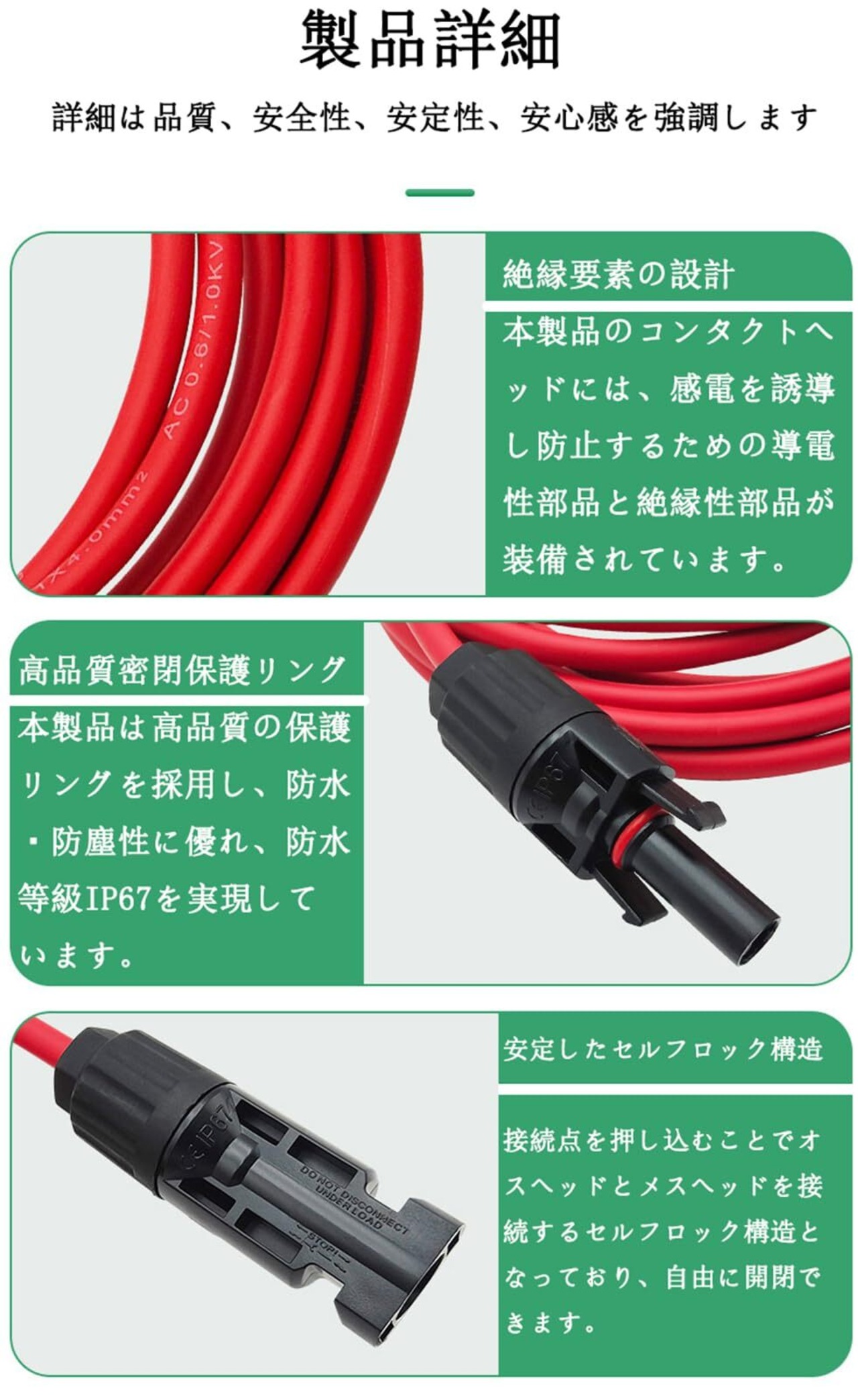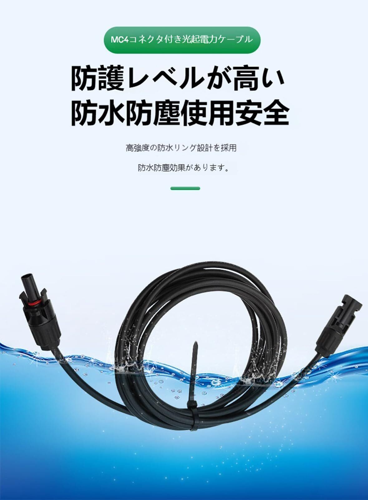 【IP67防水】MC4 延長ケーブルの外側は高品質のPVC保護カバーで、内側に防水リングが追加され、防水レベルはIP67に達します。水や粉塵などがソーラー充電ケーブル内部に侵入しないことを確保できます