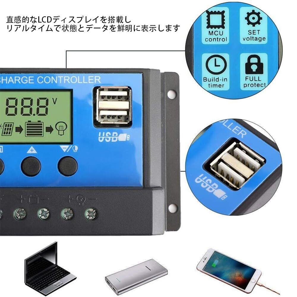 ソーラーチャージャーコントローラー 充電コントローラー 1個セット 液晶 電流ディスプレイ ソーラーコントローラー3種類のバッテリーに対応 放電機能 充電しながら 大型LCDディスプレイ 防止保護 接続用 デュアルUSB 12V/24V 調光タイミング機能付き 過負荷保護 自動調整スイッチ ソーラーパネル バッテリー 多機能調整可能