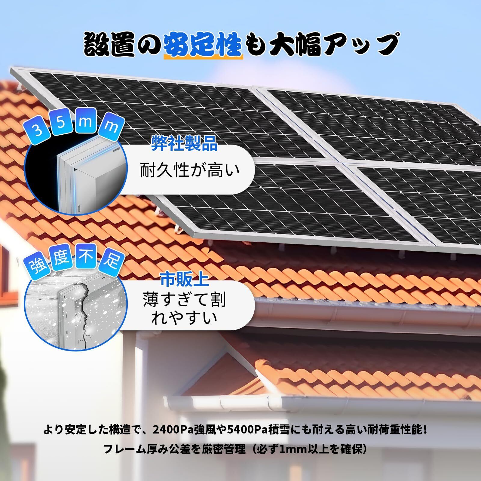 【安全性と耐久性】: 強風 (2400Pa) と積雪 (5400Pa) に耐え、表面は 3.2mm の低鉄ガラスでできており、単結晶モジュールは 35mm 幅のアルミニウム合金で囲まれており、他のモジュールより 2~5mm 広いです