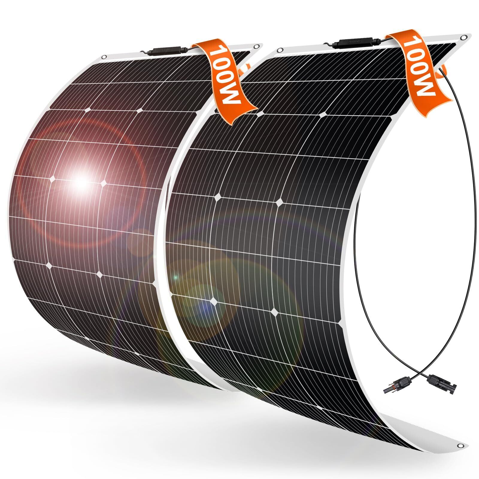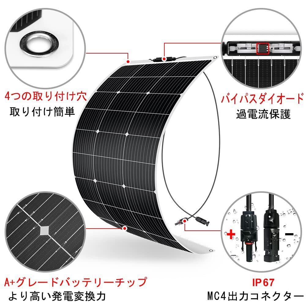 【限定セール】DOKIO フレキシブル 200W ソーラーパネル 100w*2枚 単結晶 ETFE 超軽 極薄mc4コネクター ポータブル電源充電用 太陽光パネル 曲げ可能 防水防塵 車中泊 野外 災害対策 変換効率23% 超薄型 超軽量 地震停電 防災予備品 車中泊 船 キャンプ 非常用 4つの鳩目(接続取付穴)付き 自作のソーラー発電に最適な小型・車用・家庭用太陽光パネル