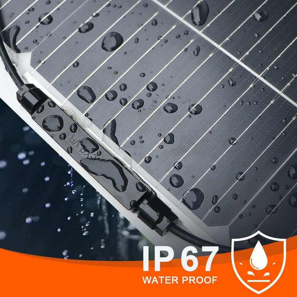 【耐久性&防水性能】防水防塵レベルが最高基準のIP67防水仕様のジャンクションボックスを採用し、厳しい環境でも安心。耐久性のある材料を使用し、強風や積雪にも耐える頑丈な設計です。フレキシブルソーラーパネルは自動車のルーフや屋上屋外、野外、ボートなどの厳しい環境下でも使えます