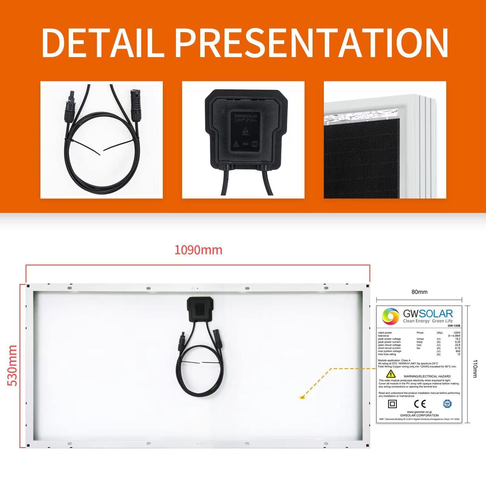【限定セール】影に強い!! GWSOLAR 120W 太陽光パネル 変換効率20.8% 全並列ソーラーパネル【12V充電: 電圧19.2V/電流 6.25A】単結晶PERC 太陽光パネル 影に強い理由: 3列のセル列全並列設計 日陰・汚れ・雪に強い【EL検査複数回実施・細長コンパクトサイズ:1090*530*30mm】GWソーラー (型番: GW-120B)