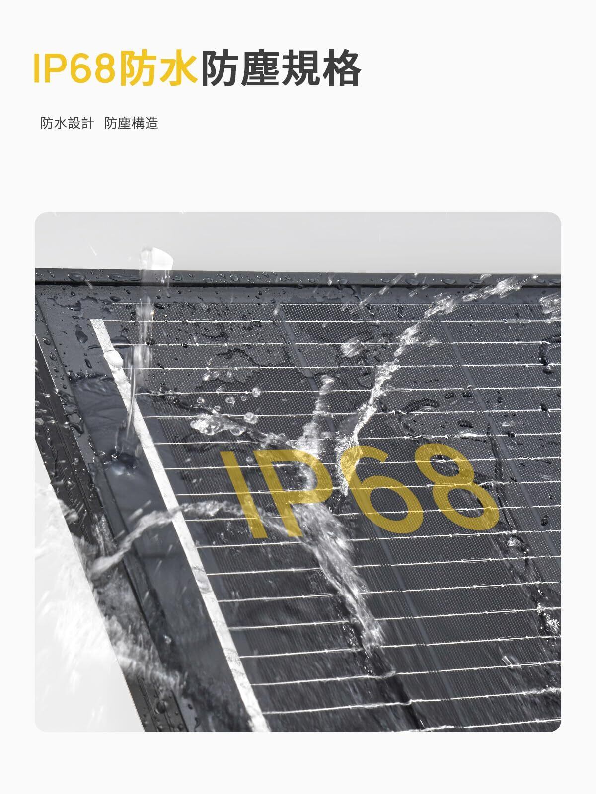 【IP68防水防塵】AFERIY 120wソーラーパネル は最高レベルのIP68耐環境性能(防塵6・防水8)を獲得。豪雨、吹雪、台風などの過酷な気象条件下でも安定稼働し、屋外使用時の信頼性を確保します。搭載のMC4コネクタもIP67防水性能を備え、日常生活から厳しい環境まで幅広く対応可能です。