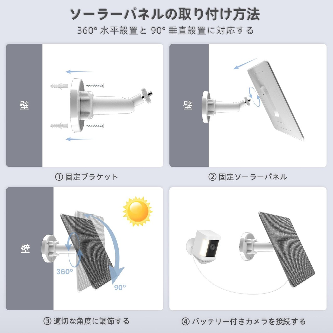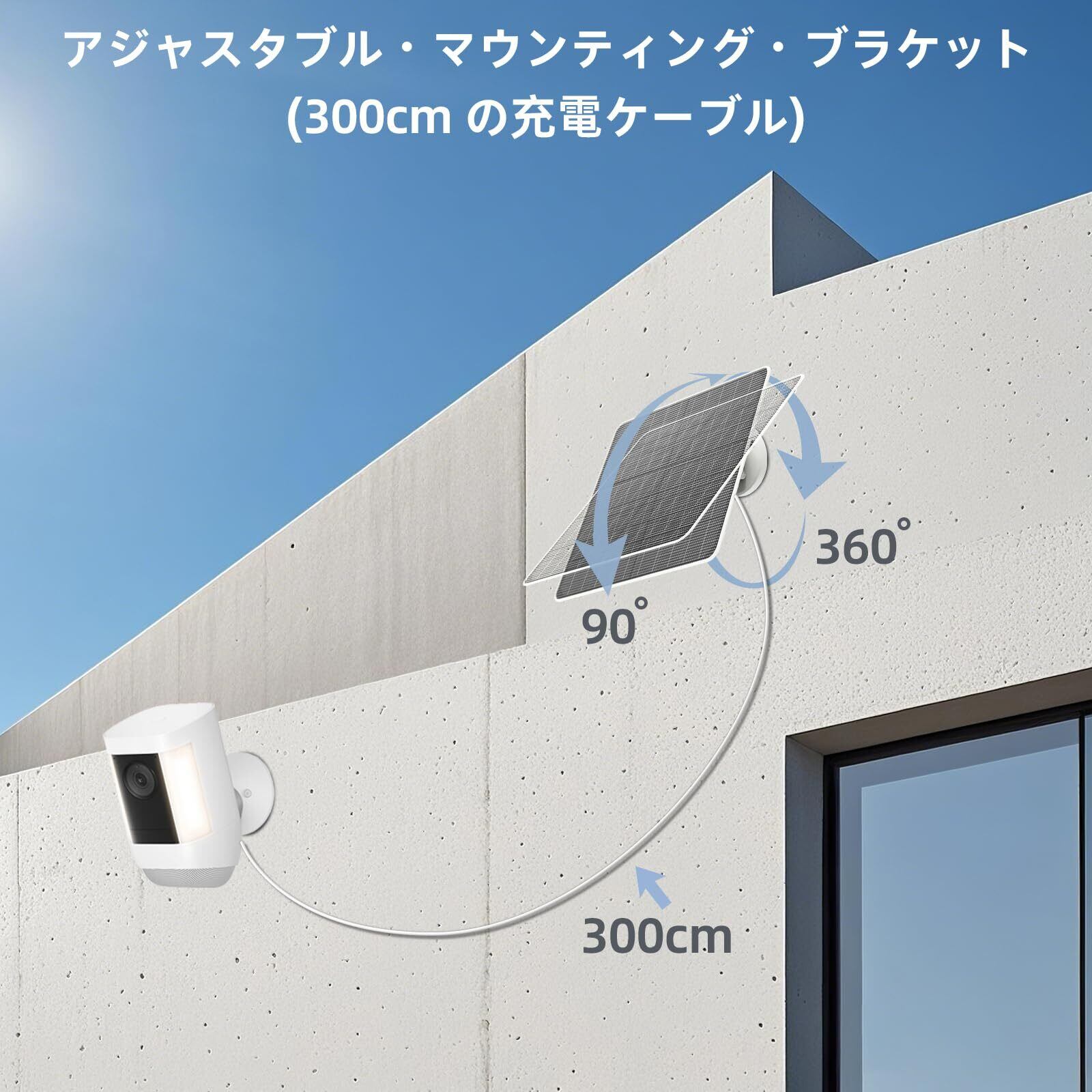 【簡単な設置】360 度調節可能な壁取り付けブラケットを壁に取り付け、太陽光パネルを最適な角度に調整することで、多くの日光を得ることができます。これにより、ワイヤレスカメラの充電を頻繁に行う手間がかからなくなります