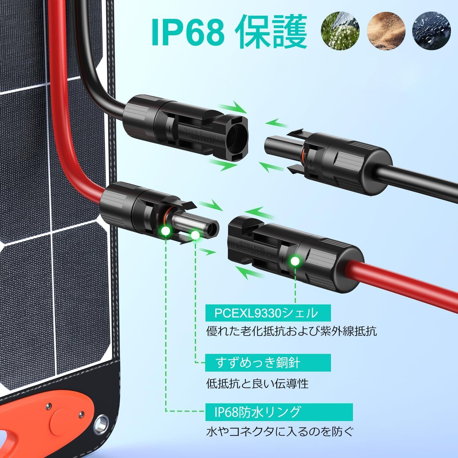 【柔軟性】 ケーブルは柔軟性と耐久性に優れているため、自由自在に折り曲げていただくことや、使用しない際は小さくまとめて収納していただくことが可能です。また、複雑な隙間などにも通して頂けますので、大変便利なアイテムとなっております。 ソーラーケーブルの絶縁層は、難燃性、自己消火性、高強度、耐摩耗性、耐腐食性に優れた優れたPVCでできています。