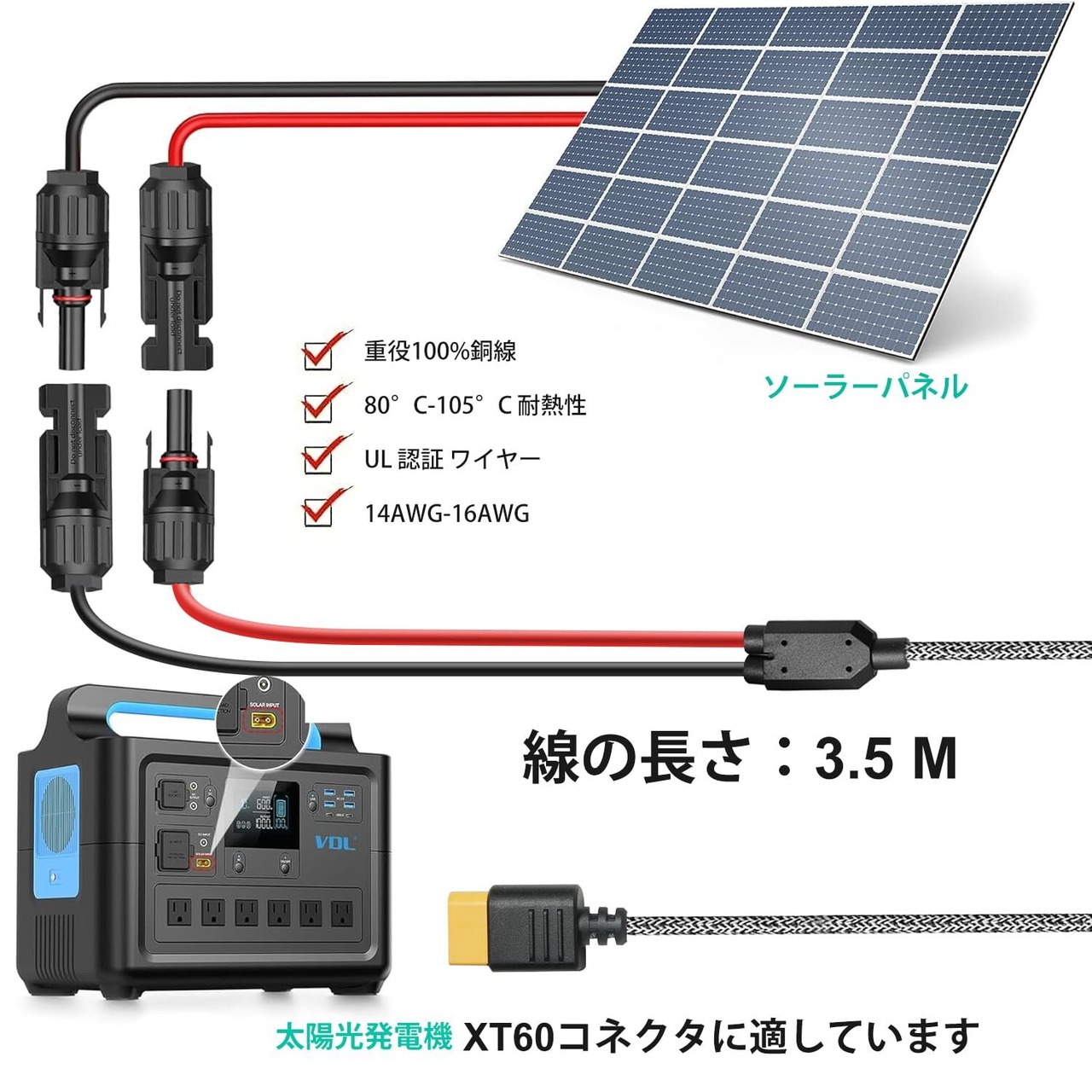 【ソーラーケーブル MC4 コネクタ】XT60を対応できます。長さ3.5m、 16AWG,一端MC4コネクタで終端され、他端はXT60急速出力ポートです。機器に安定した電流を供給します。端子タイプ:MC4コネクタ、防水レベルはIP68に達します。取り付け簡単で、接続後すぐに使用できます。ポータブル電源と家庭用RVを充電するための最良の選択。