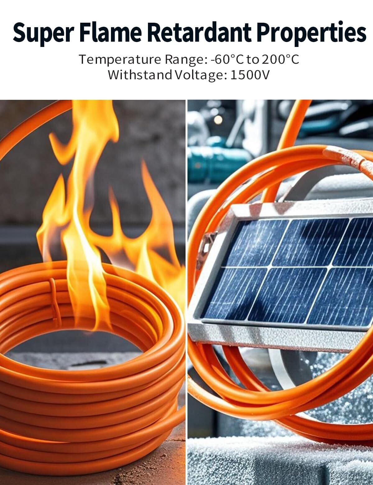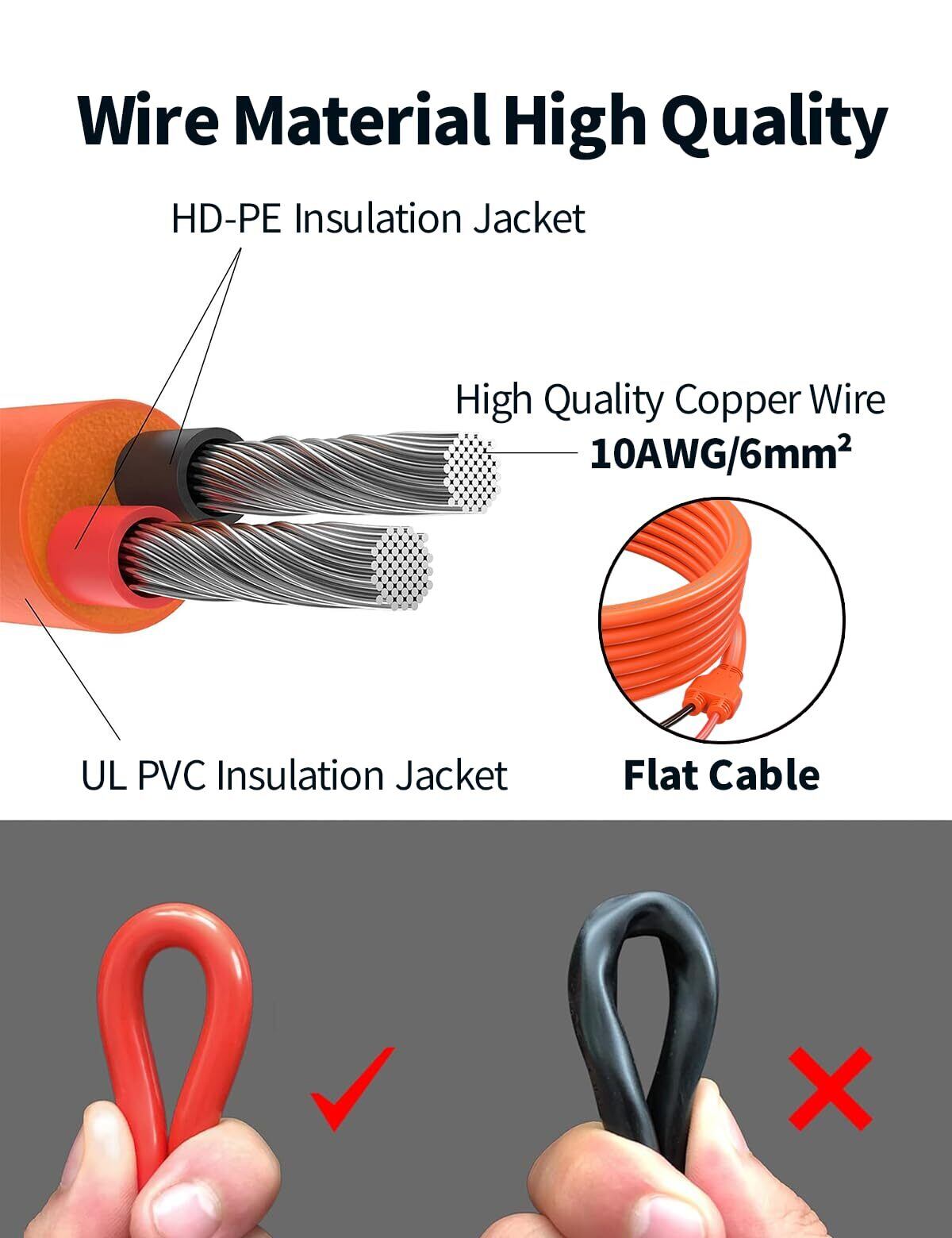 【高い耐久性 】ケーブルは10AWGワイヤで作られており、屋外でも安心してお使いいただける高い耐久性を実現しました。動作温度は零下60℃から200℃まで 対応電圧:DC1500V 許容電流: 54A