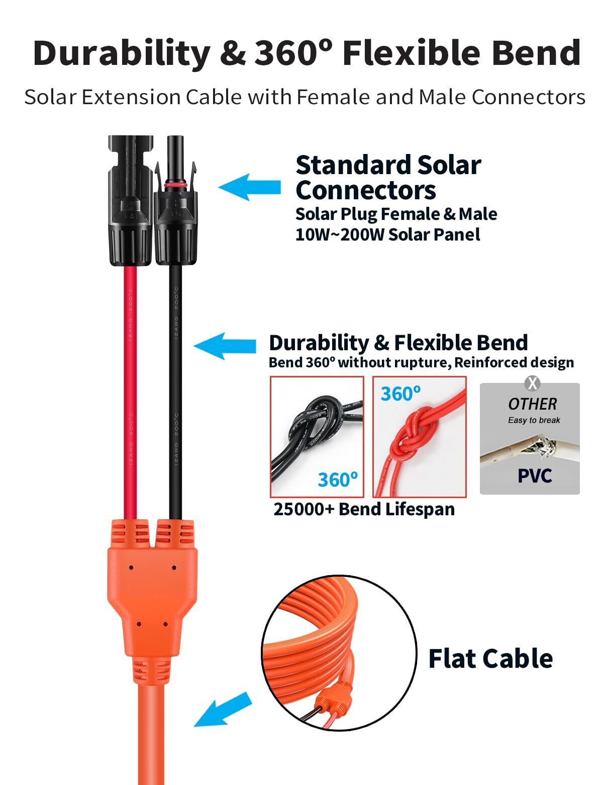 【一体型デザイン 】アップグレードされた一体型ソーラー延長ケーブルは、黒と赤の別々のワイヤーを必要とせず、合理化された絡みにくいデザインを提供します。この技術革新により、ケーブルの乱雑さが減り、設置が簡素化され、長期間使用できる耐久性の高い接続がされます。また、鮮やかなオレンジ色は視認性を高め、設置時の識別や管理をしやすいです。