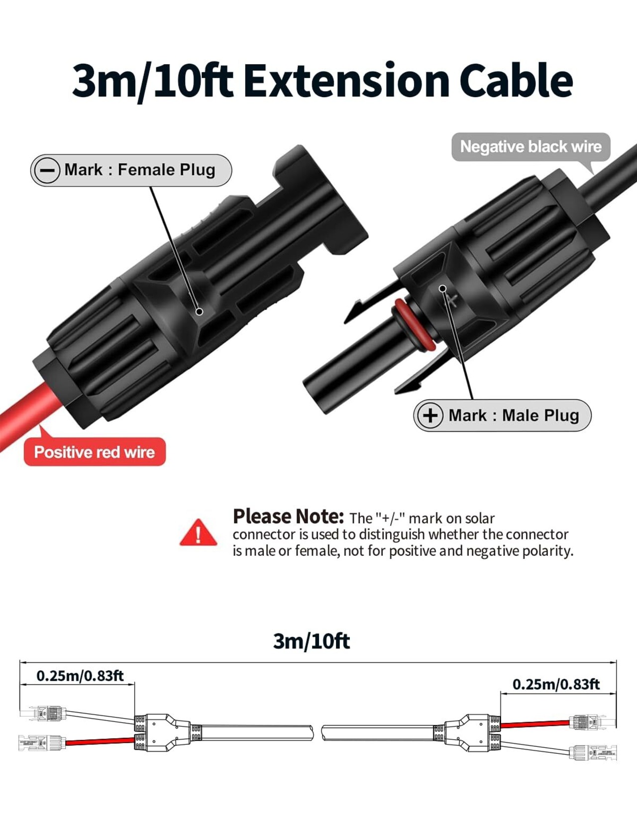 【パッケージ内容】3m 10AWG MC4-MC4延長ケーブルx1 ご注意 :ご購入の前に必ずご使用のデバイスのコネクター仕様と極性をご確認ください。