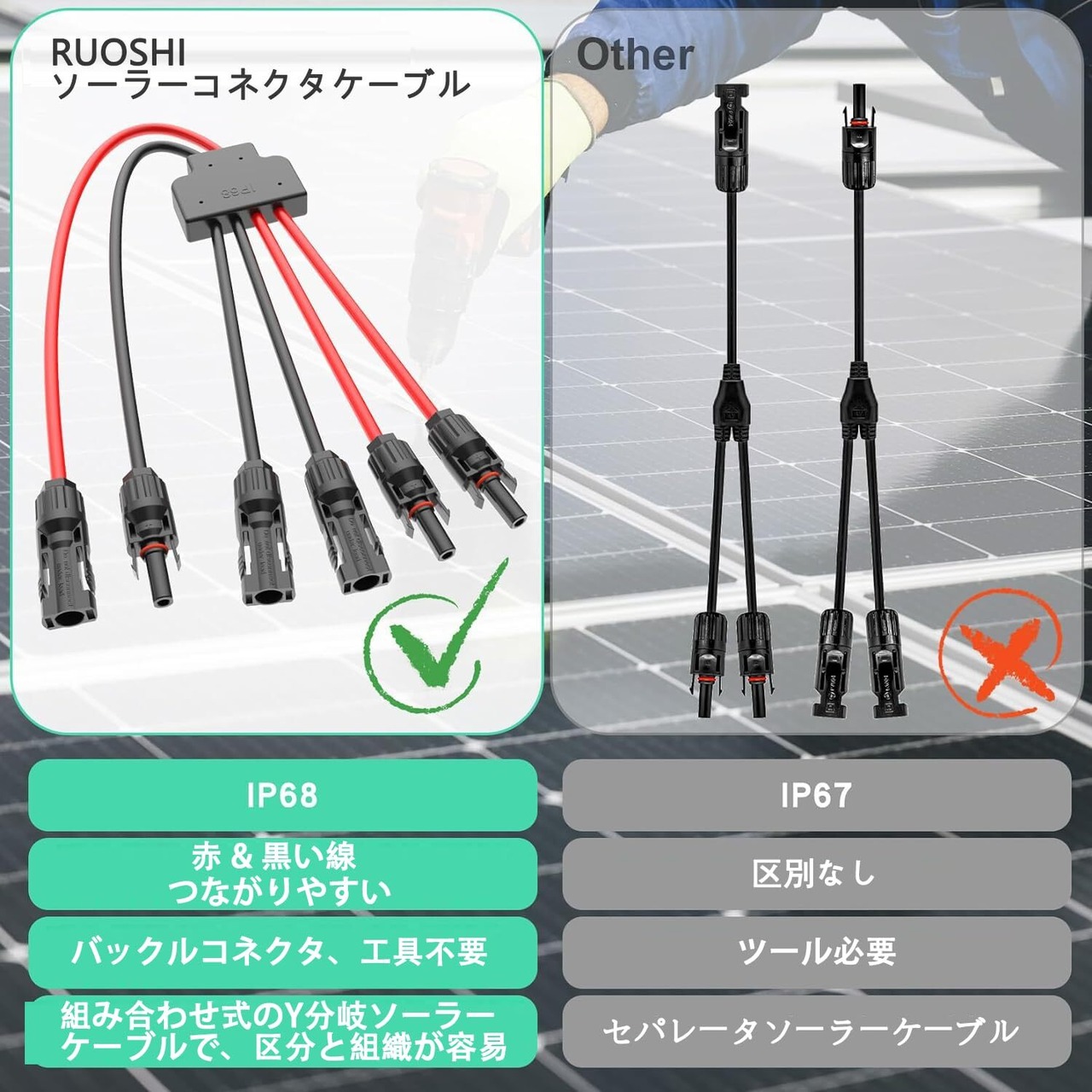 【プラグアンドプレイ】:ツールレスソーラーバッテリーパネルコネクタケーブルは安全で信頼性の高いコネクタを有し、ケーブルとソーラーバッテリーパネルまたは設備との緊密で安定した接続を確保でき、ツールの助けなしで迅速に接続と切断ができる。旧バージョンに比べてY分岐ソーラーケーブルを統合し、赤黒い線を分離して、区別と接続が容易になり、組織も容易になります。また、弾性片コネクタ設計を採用しており、接続や取り外しツールは不要です。 この安全な接続により、電気的な問題や接続切断のリスクが最小限に抑えられ、ソーラーシステムの安全性と効率が向上します。