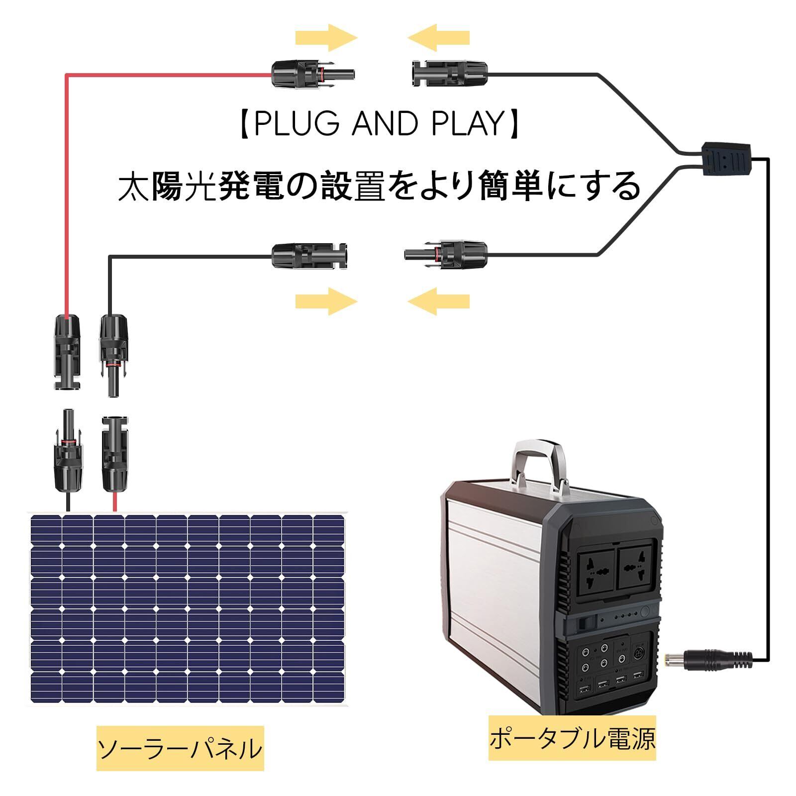 ソーラーパネル・ケーブル: 各ソーラーケーブル延長の両端にはプラグが付属しており、複数のケーブルを接続して長さを延長することができます。