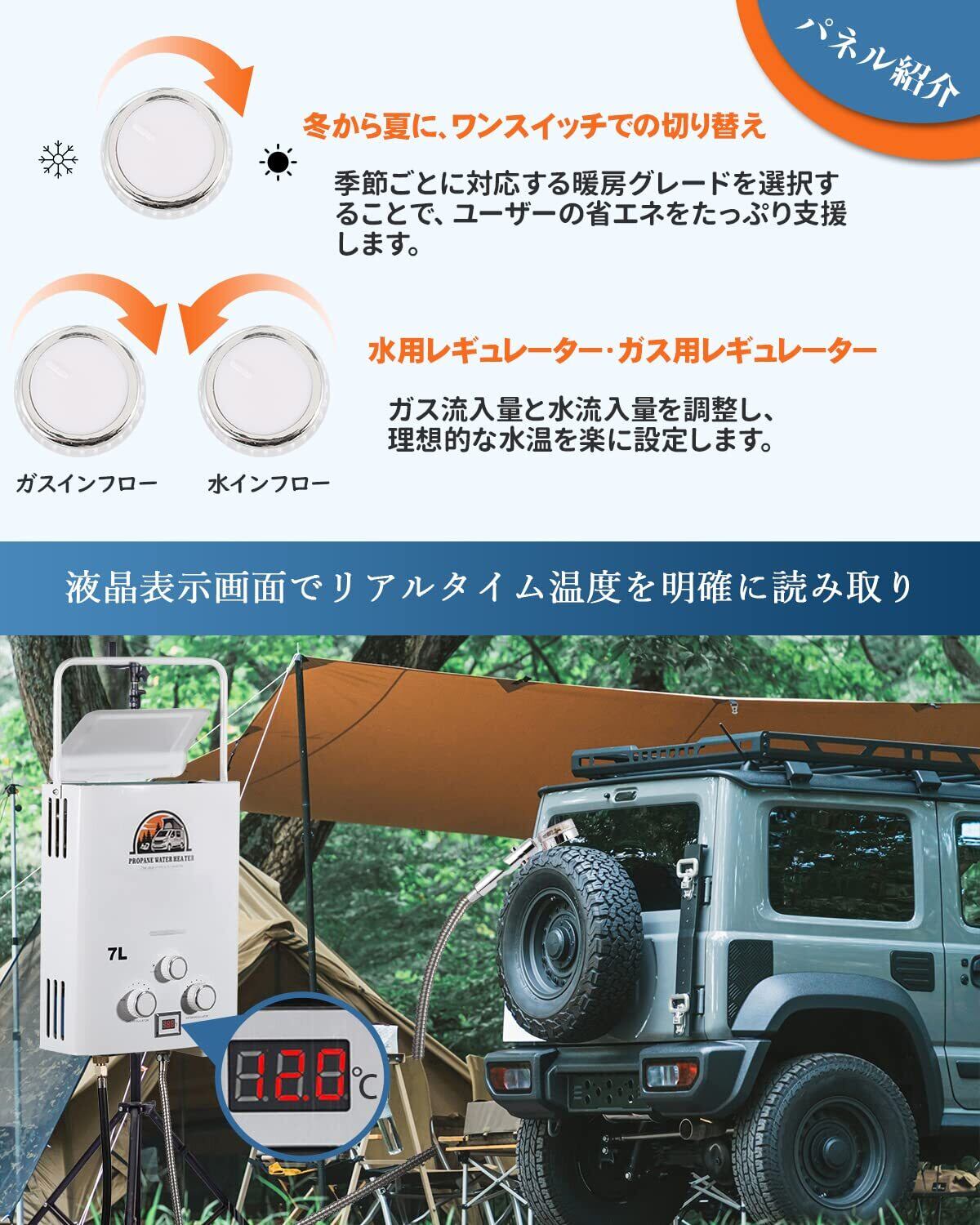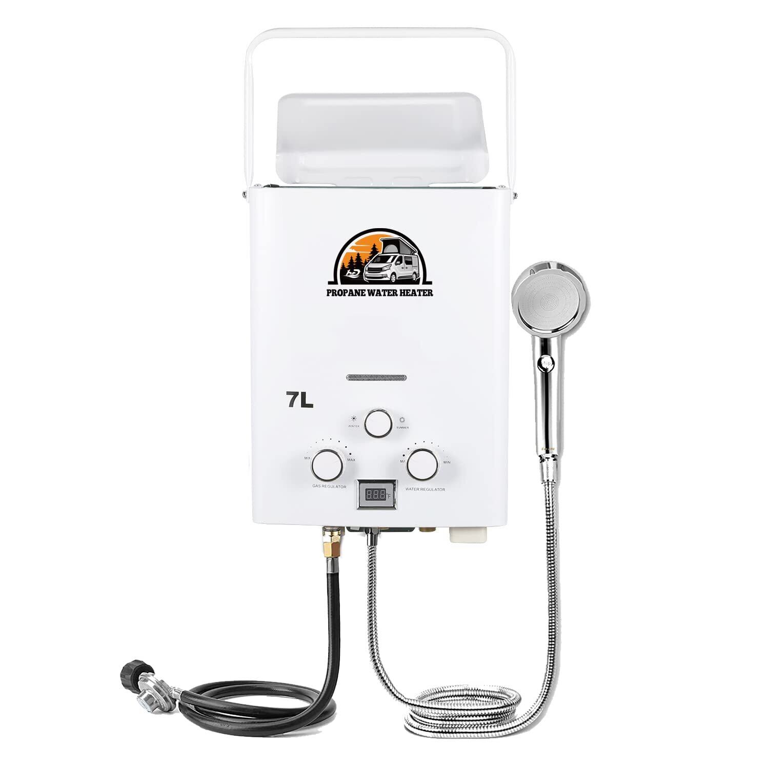 【限定セール】携帯用LPガス給湯器 7L タンクレス 湯沸器 1.85 GPM 熱湯ヒーター 取り付け簡単 過熱保護 オートストップ機能 摂氏(℃)のデジタル表示 RVシャワー/キャンピング/キャビンボートに適用 白