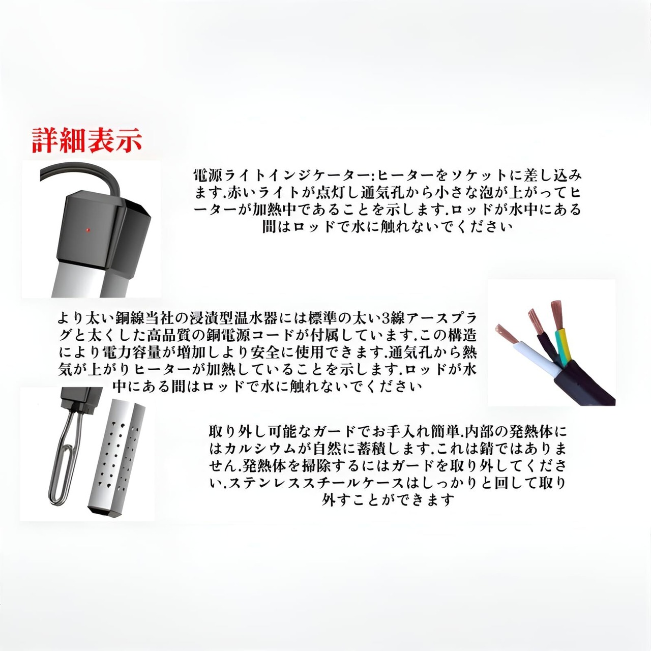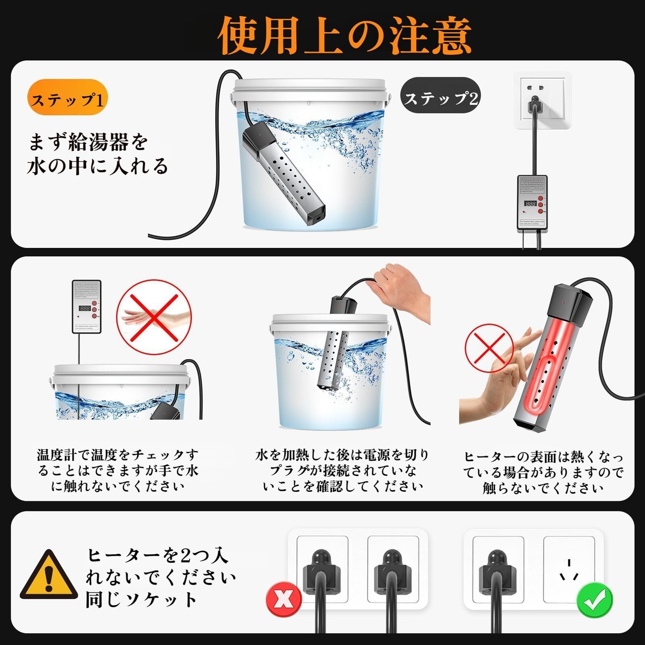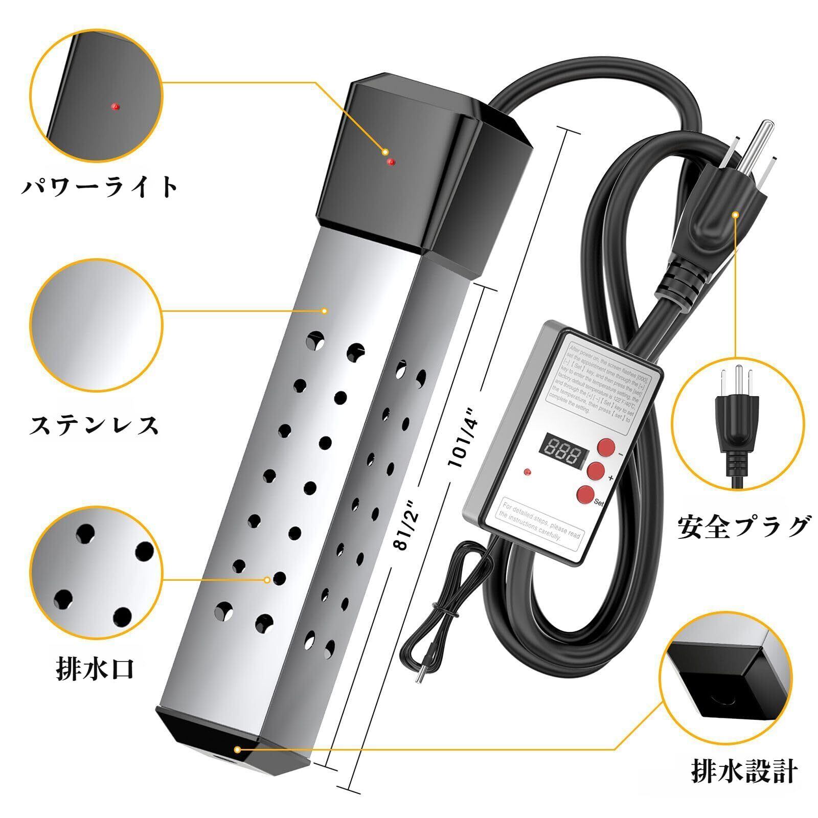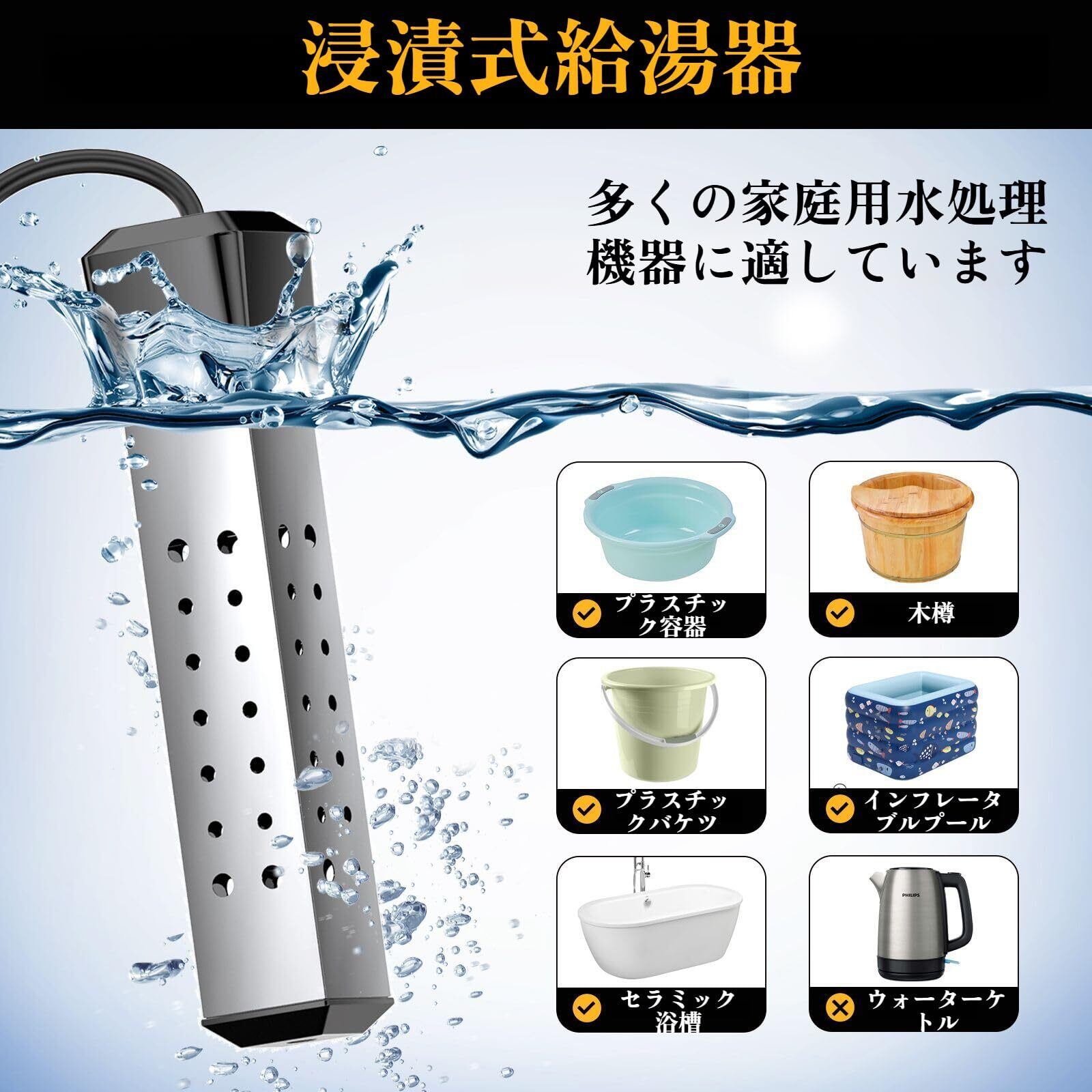 【完全防水&空焚き防止で安全設計】IPX7防水仕様で、完全に水没しても短絡しません。空焚き防止センサー内蔵で、ヒーターが水から出ると自動停止。ステンレス製ボディとやけど防止グリップで、取り扱い中の事故を未然に防ぎます。