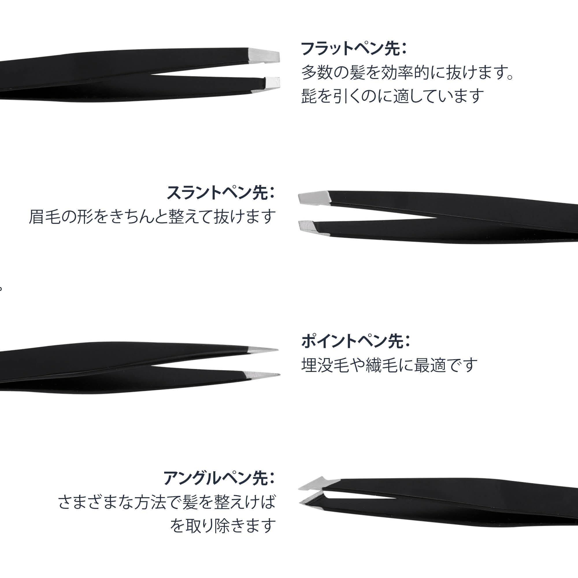 細部にわたる精密性: 先平、先斜め、先尖り、先尖り斜めを備えた4本の毛抜き用ピンセットのセットです。身だしなみの質を高めましょう。細かいところまで眉毛の形を整えたり、頑固な埋没毛への対処まで、さまざまな用途に合わせて調整されています。