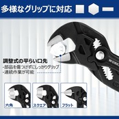 【自動調整ジョー】プッシュロックボタンにより、ジョーの開口幅を素早く調整可能です。自動調整ジョーにより、ボルトやナットを連続して回しても、各回ごとに工具を再調整する必要がありません。平行で滑らかなジョーは、傷を付けないグリップを提供します。