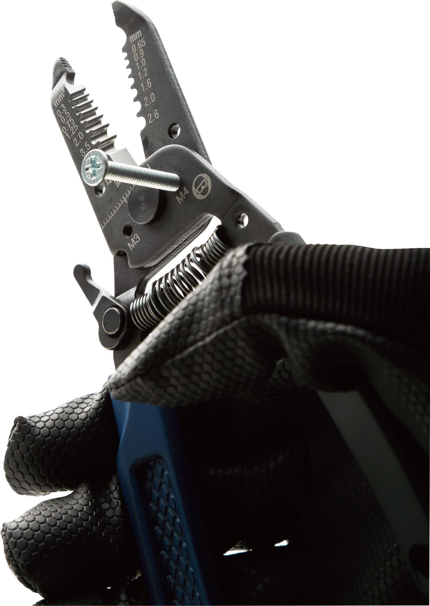 刃が真円形状で芯線を傷つけない。●自然に握り方向が決まるダブルカラーで作業効率がアップ。●力が入りやすいエラストマーグリップ。●ネジカッター付。●ストリップ長が測れる目盛付き。●落下防止コードが取り付けできる穴付き。●適用電線:線径0.65/0.9/1.0/1.2/1.6/2.0/2.6mm●柄色:青●重量(g):107●サイズ(mm):D163×W51×H13●材質:特殊工具鋼(ブレード)/S55C(本体)/熱可塑性エラストマー(TPE)(ハンドルカバー)