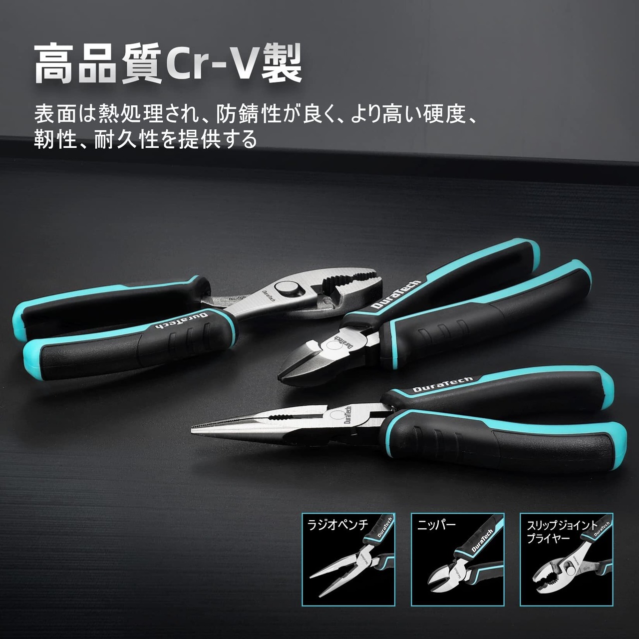 【優秀な鋼材質】DuraTechペンチは高品質なCr-V鋼を使用して、表面に面取り加工と電着塗装処理を行って、防錆性が良く、より高い硬度、より良いクランプ力、靭性、耐久性を提供します。