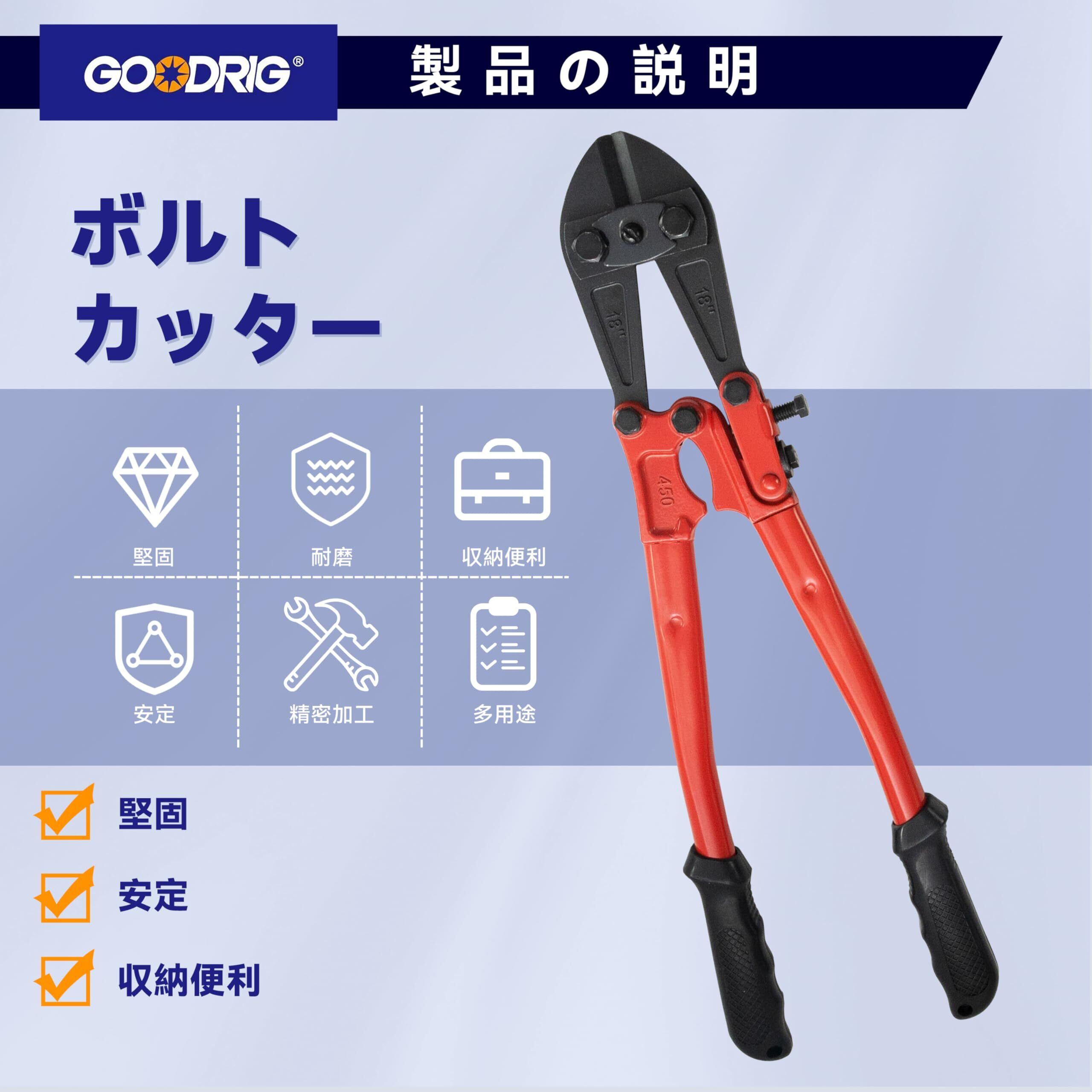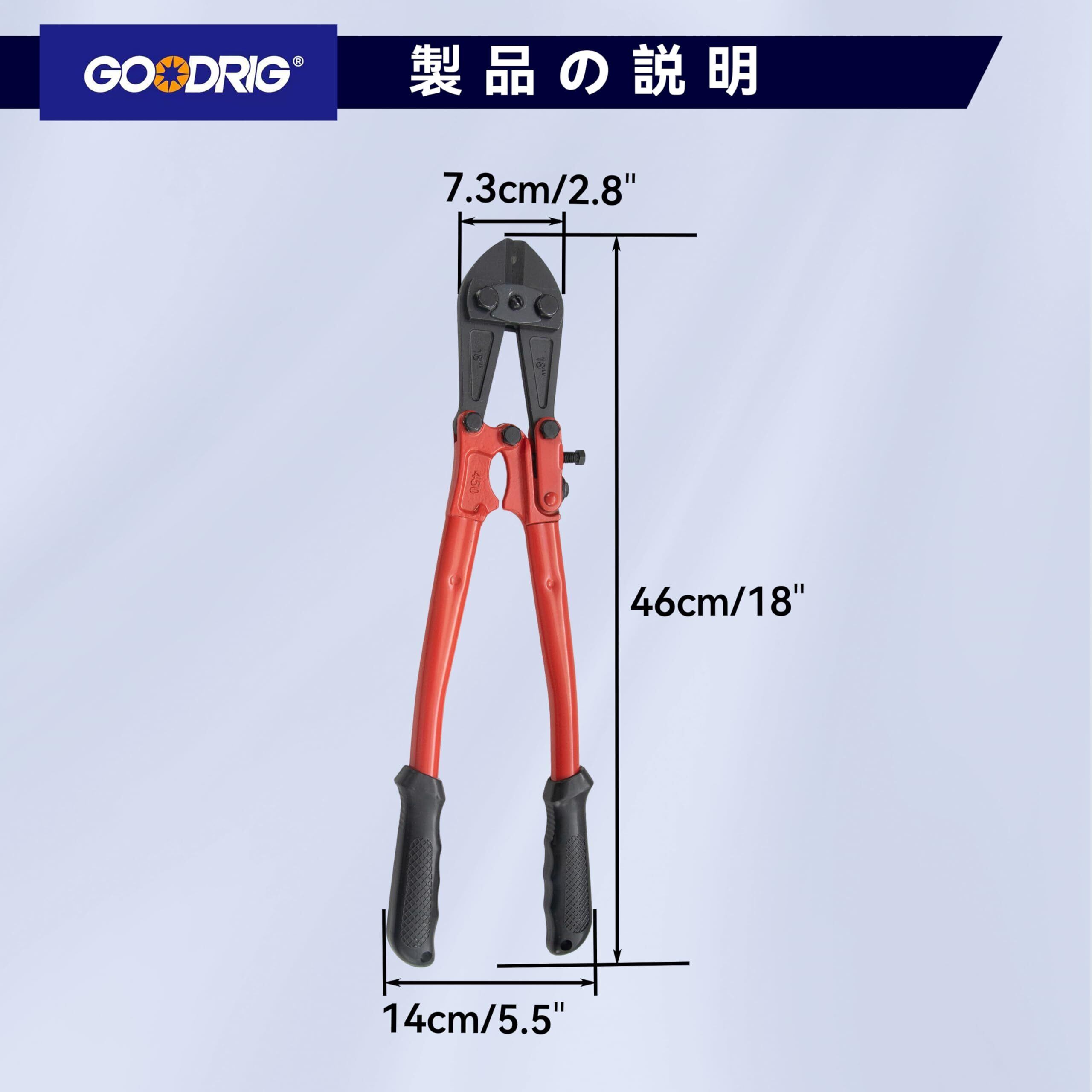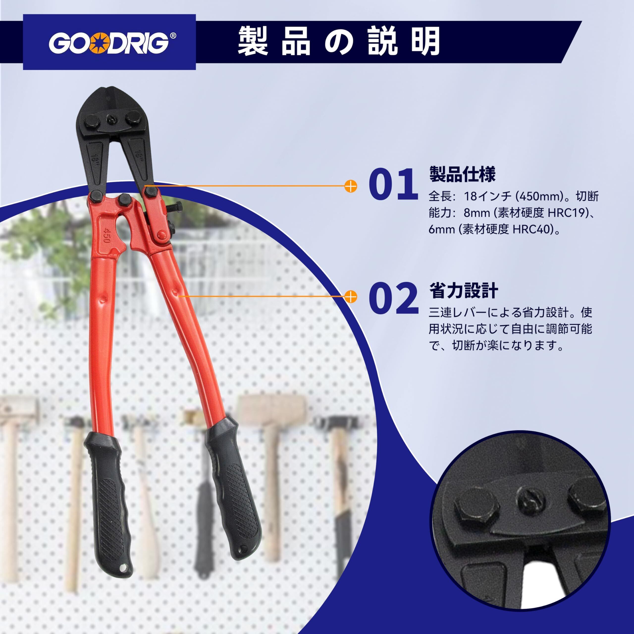 【製品素材】カッターヘッドはクロムバナジウム鋼製で、高硬度・高靭性・高耐摩耗性を備えており、繰り返しの切断でも刃こぼれや変形、摩耗や破損が起こりにくいです。 アーム部は45#鋼を鍛造成形しており、高い硬度と靭性を持ち、作業中に破損や変形しにくくなっています。 【製品仕様】製品全長:18”(450mm); 切断強度:⌀8mm(HRC19),⌀6mm(HRC40)。 【開口調整可能】アーム前端に調整ネジが付いており、カッターヘッドの開き幅を微調整できます。 【滑り止めグリップ】グリップ部分は人間工学に基づいた設計のプラスチック製で、手にフィットし、握りやすく滑りにくくなっています。 【使用シーン】家庭の修理、工事現場、DIY作業などで、鉄筋・針金・ボルトなどの比較的太く硬い金属部品の切断に適しています。