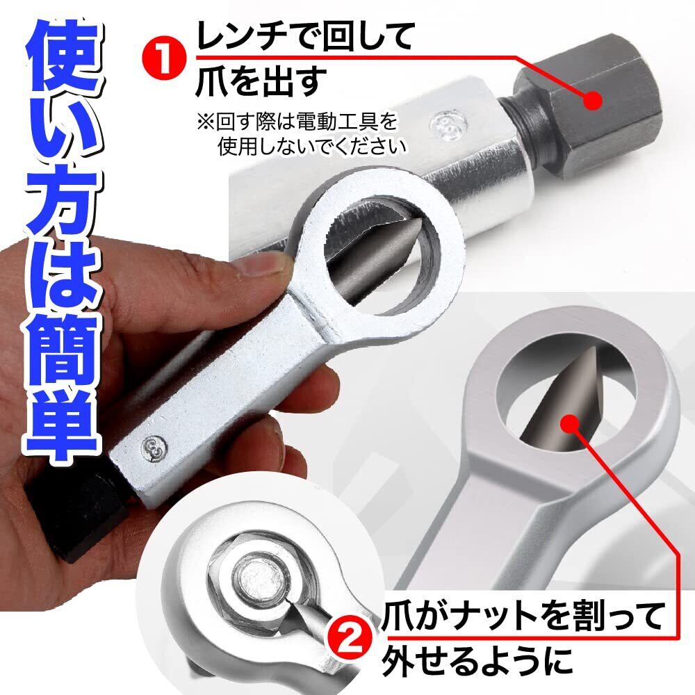 【使い方も簡単】ナット部分に本体を取り付けて、ゆっくりレンチなどで回していきます。ナットが割れた後は緩めて、本体とナットを外してください。回す際は電動工具を使用しないでください。