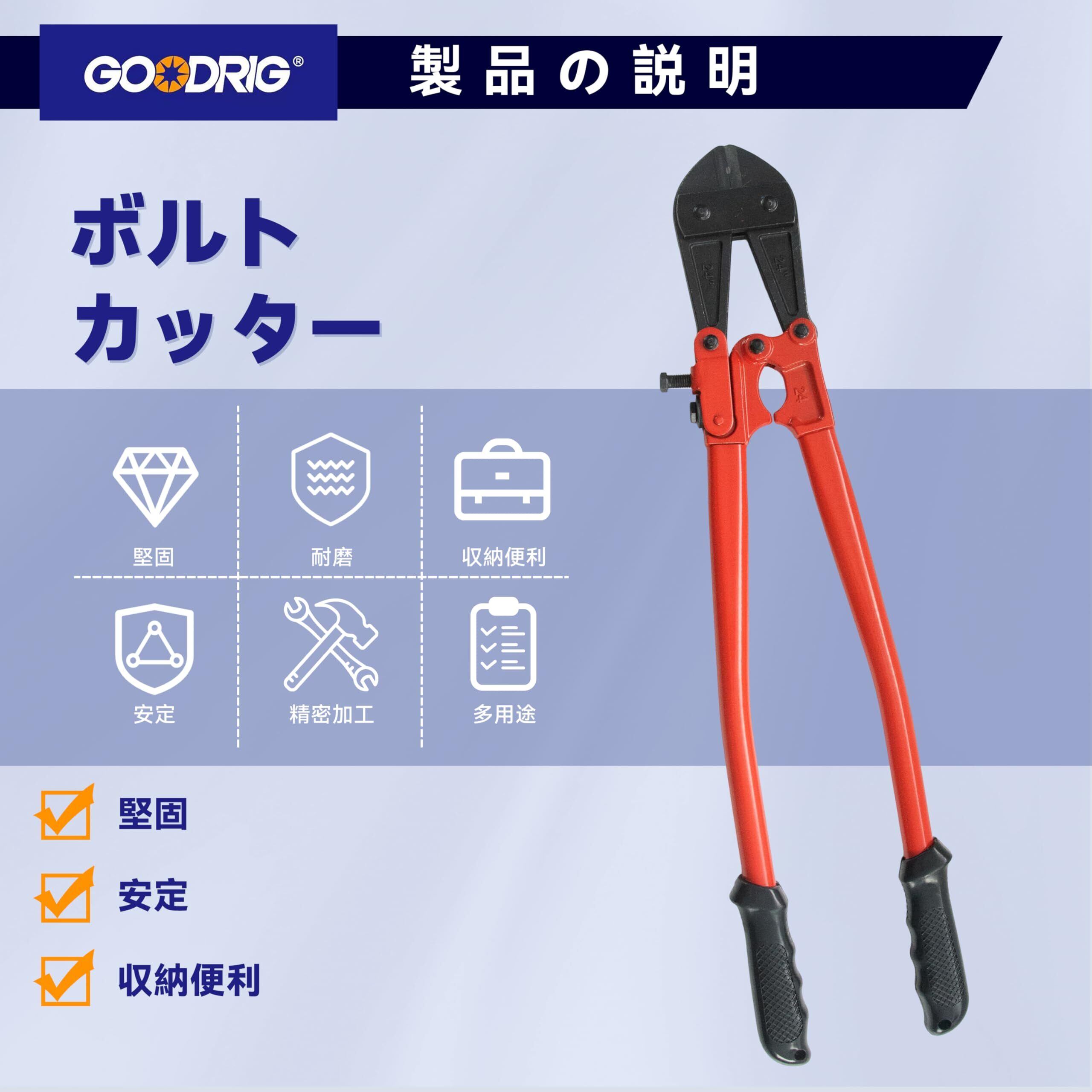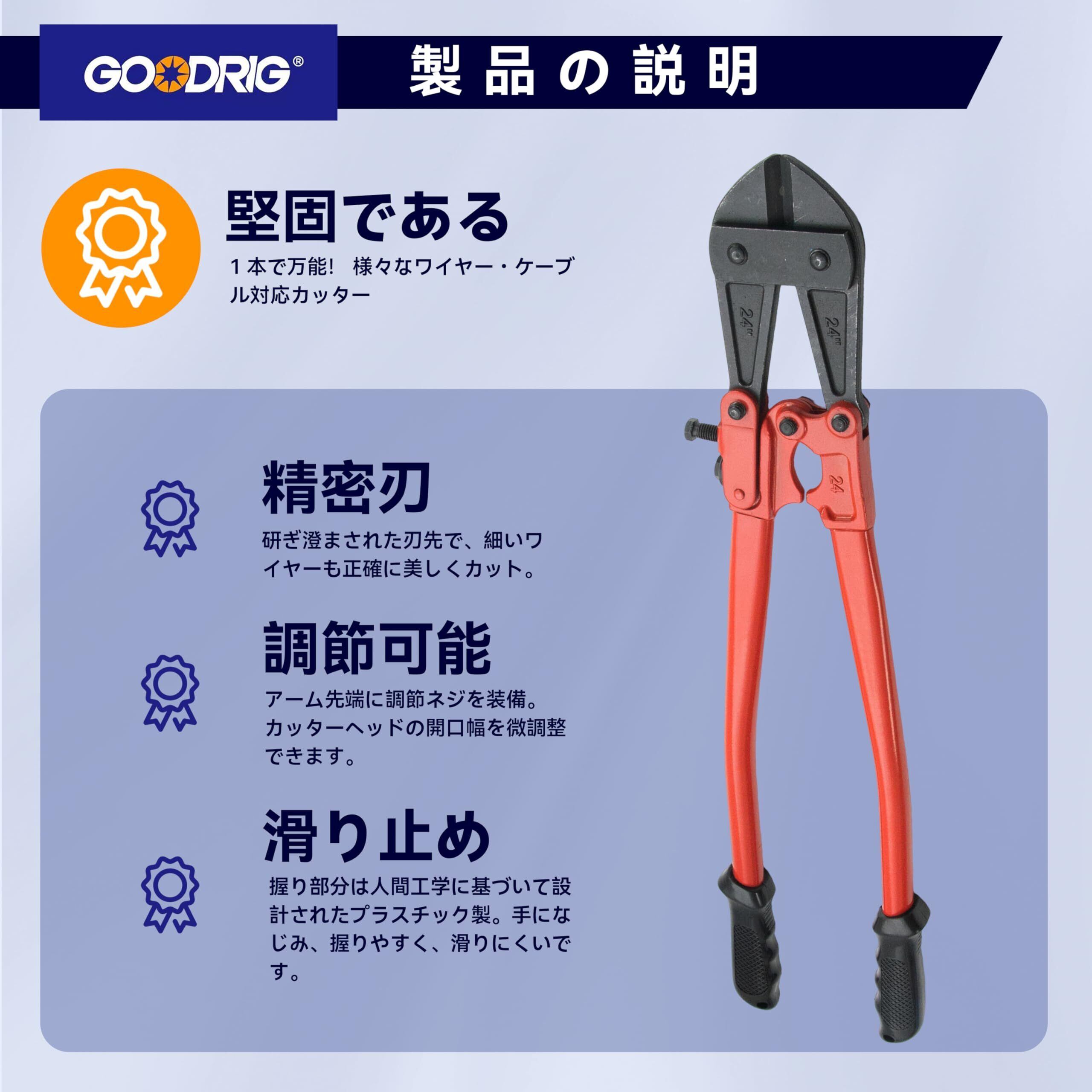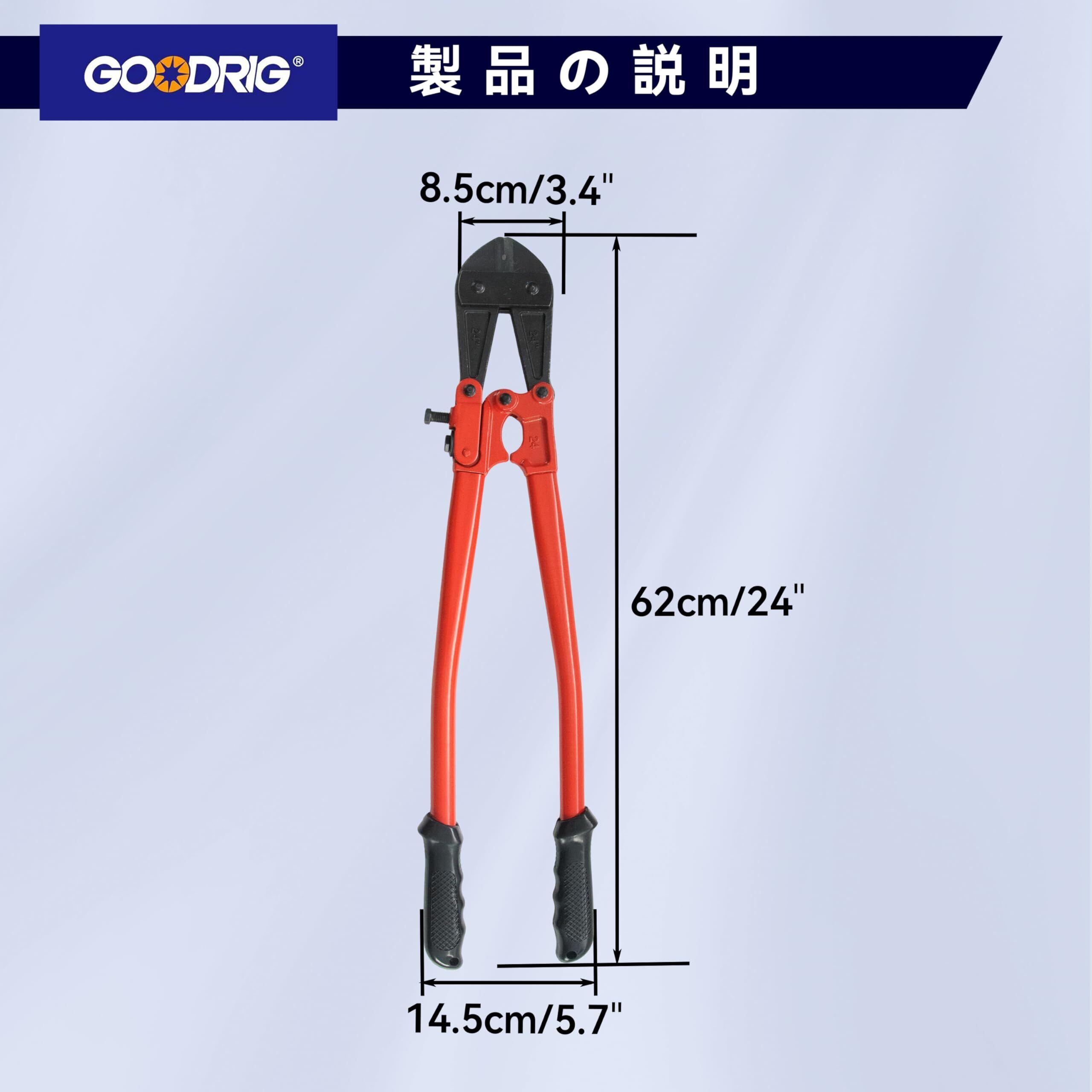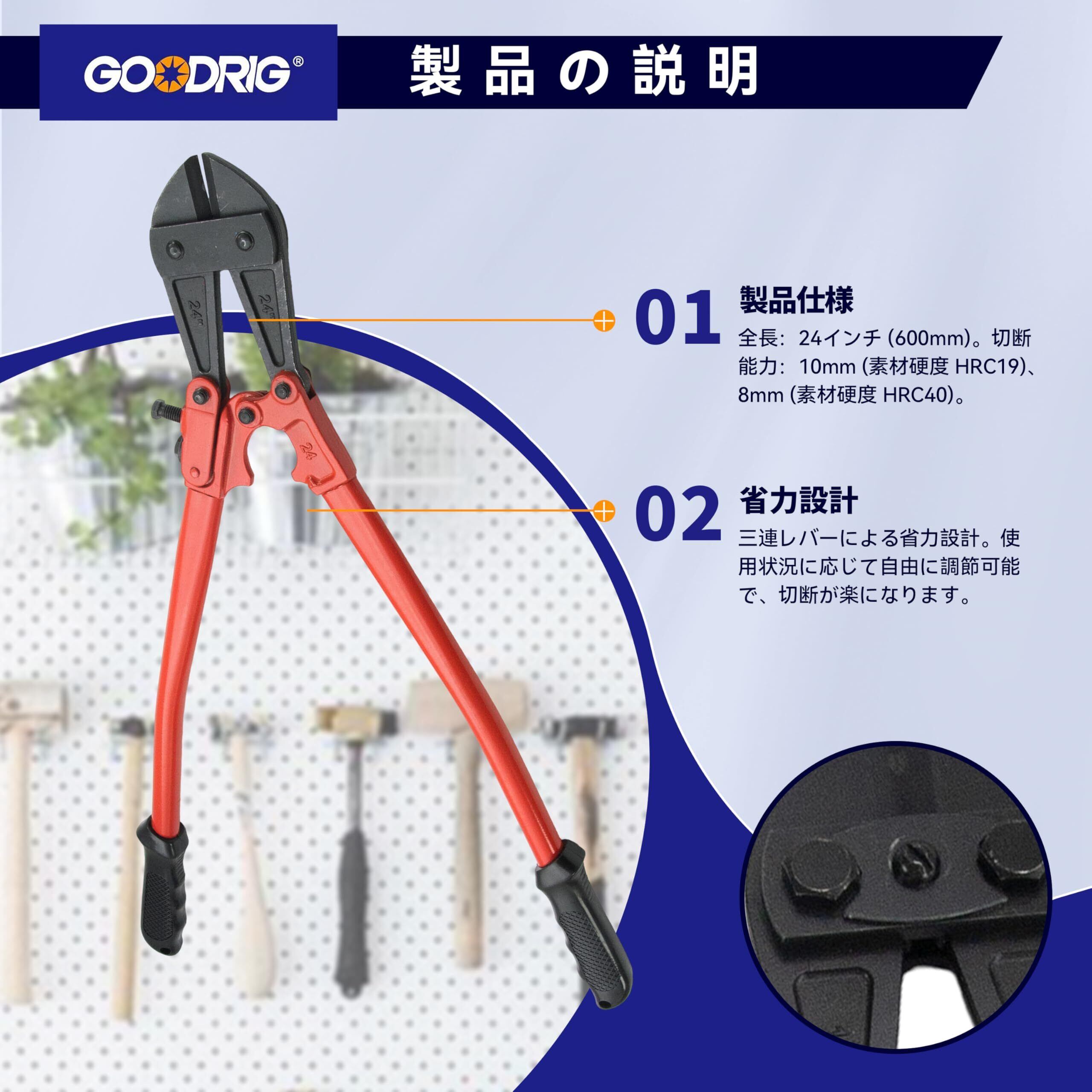 【製品素材】カッターヘッドはクロムバナジウム鋼製で、高硬度・高靭性・高耐摩耗性を備えており、繰り返しの切断でも刃こぼれや変形、摩耗や破損が起こりにくいです。 アーム部は45#鋼を鍛造成形しており、高い硬度と靭性を持ち、作業中に破損や変形しにくくなっています。 【製品仕様】製品全長:24”(600mm); 切断強度:⌀10mm(HRC19),⌀8mm(HRC40)。 【開口調整可能】アーム前端に調整ネジが付いており、カッターヘッドの開き幅を微調整できます。 【滑り止めグリップ】グリップ部分は人間工学に基づいた設計のプラスチック製で、手にフィットし、握りやすく滑りにくくなっています。 【使用シーン】家庭の修理、工事現場、DIY作業などで、鉄筋・針金・ボルトなどの比較的太く硬い金属部品の切断に適しています。