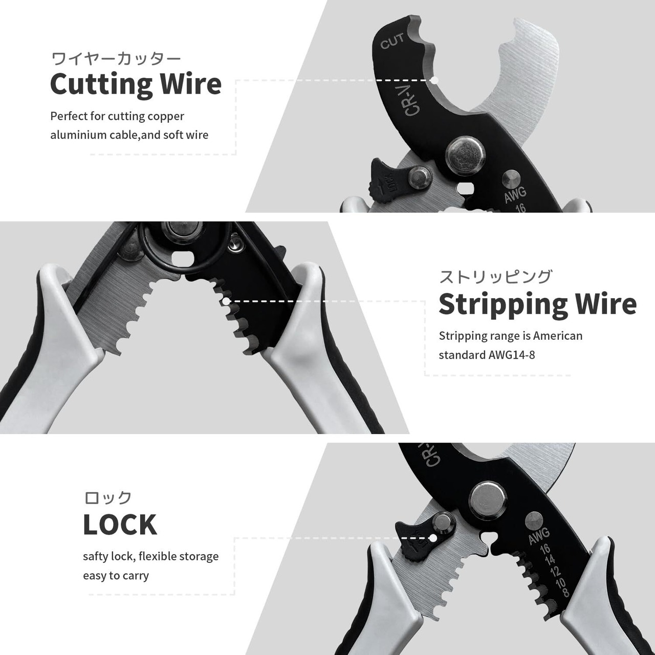 【安全ロック付き】ケーブルカッターには安全ロックがついているので、持ち運びにも便利です。