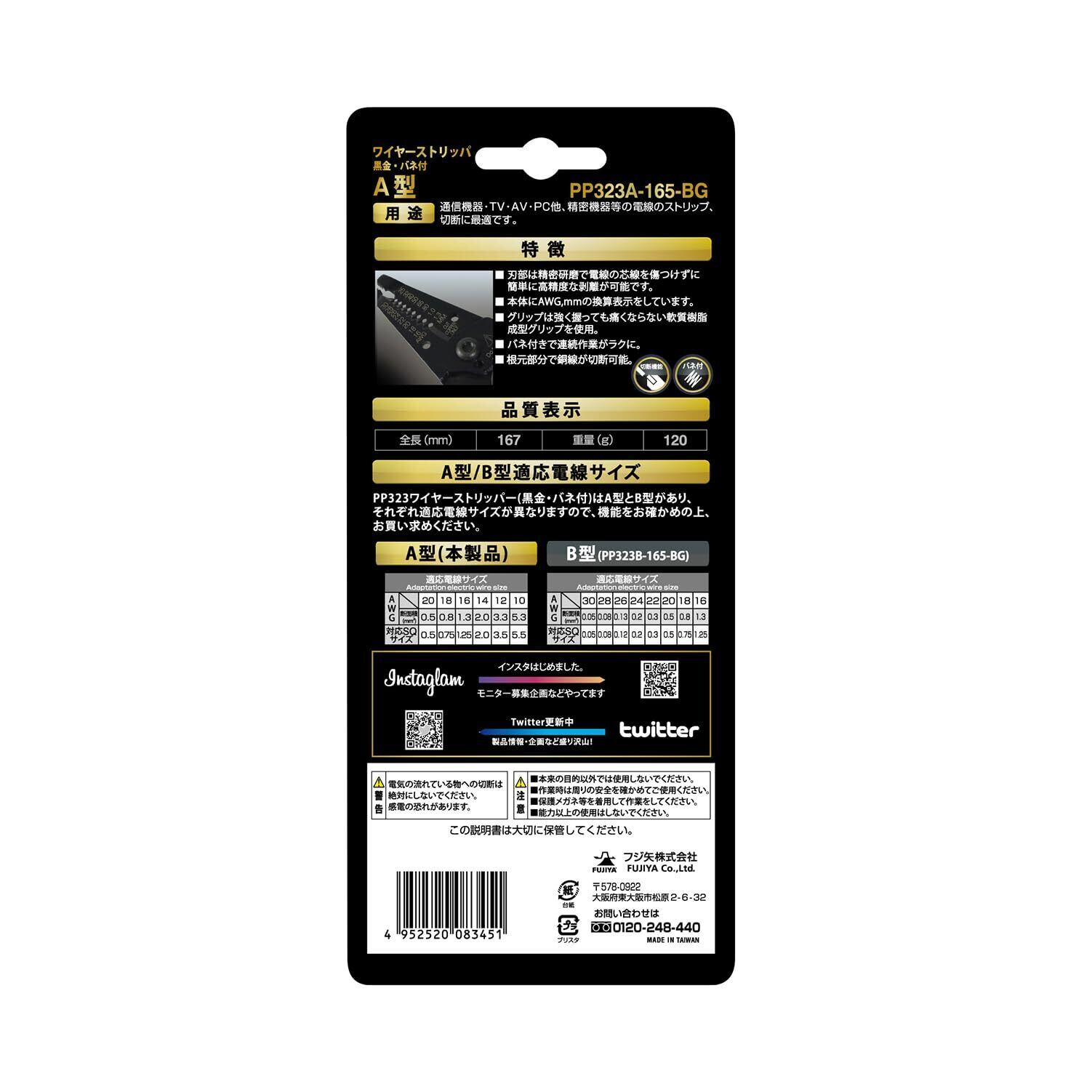 フジ矢 ワイヤーストリッパA型 165mm 黒金・バネ付 PP323A-165-BG