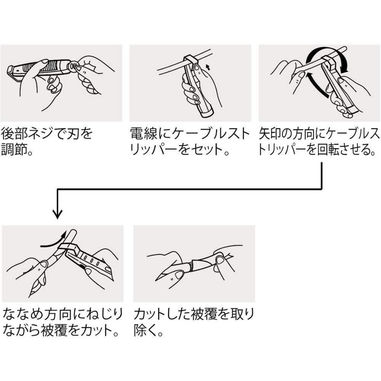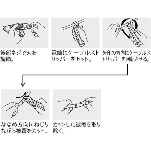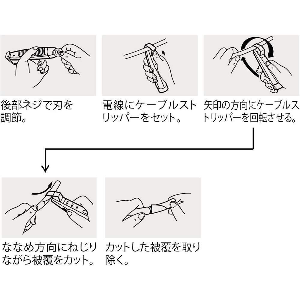 ●フック部を電線にセットして回転するだけで電線を傷つけないで被覆を簡単に切り取ることができます。●スペア刃を本体に内蔵しています。●特殊硬鋼線の精密研磨仕上げ刃で切れ味を持続しました。●グリップに特殊樹脂を使用し、手に馴染みやすく、疲れない独自のフォルムです。