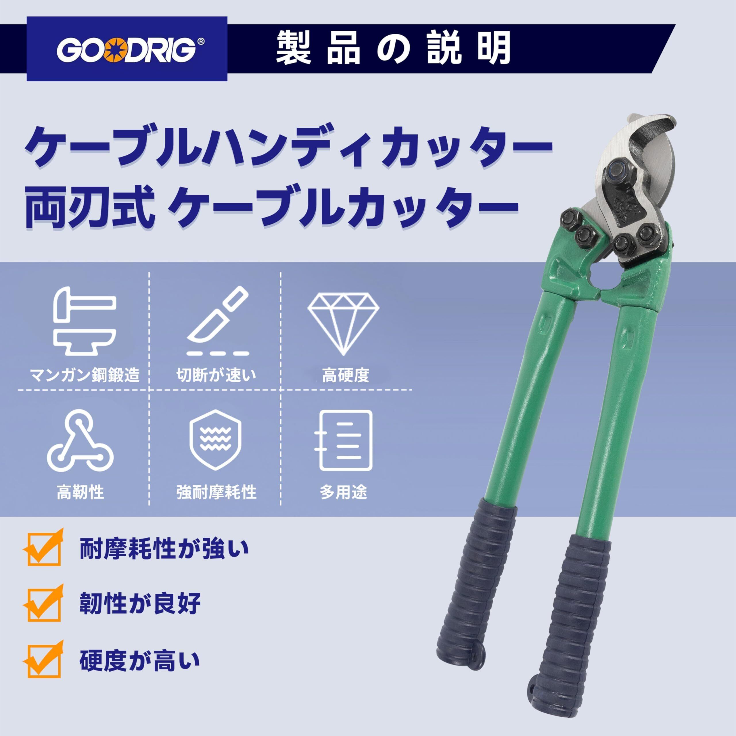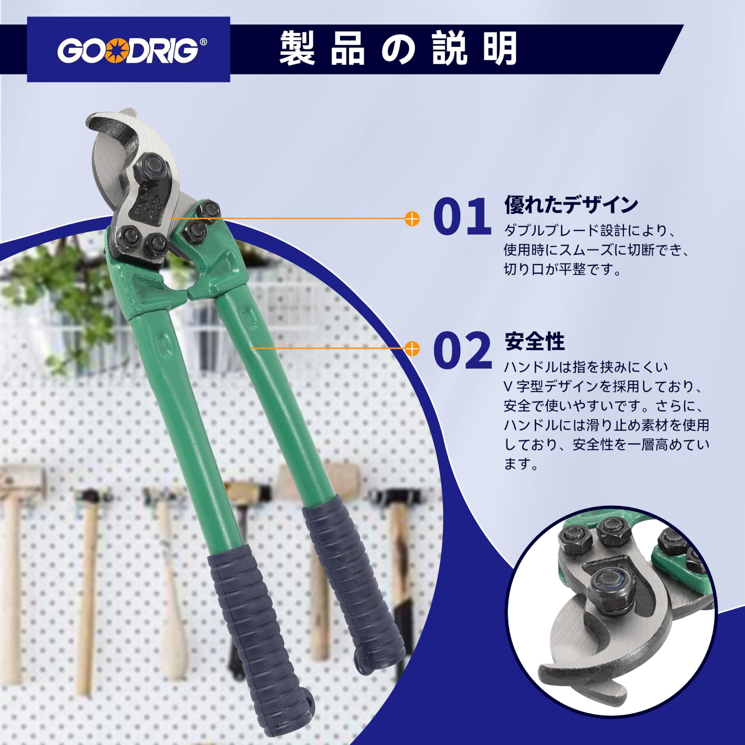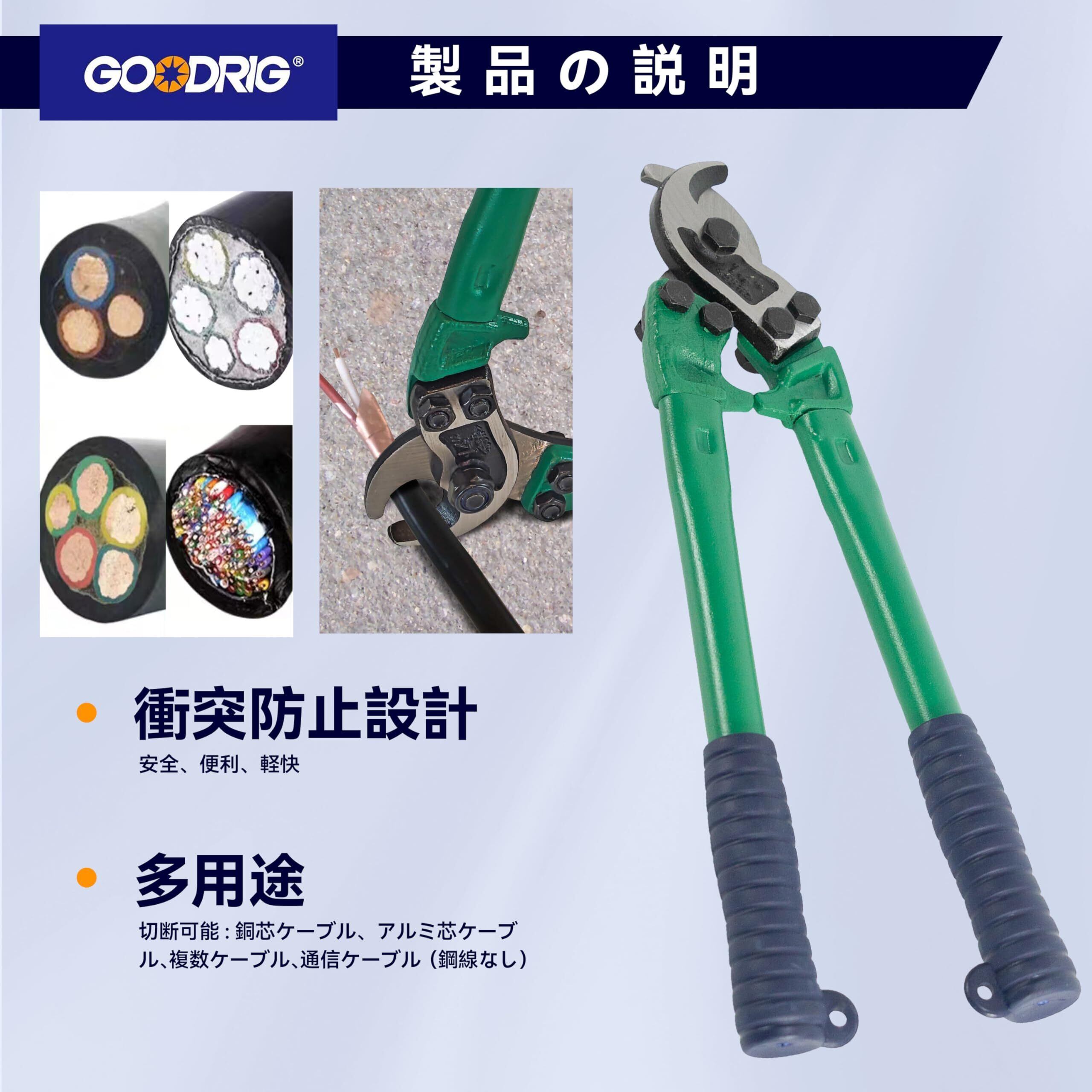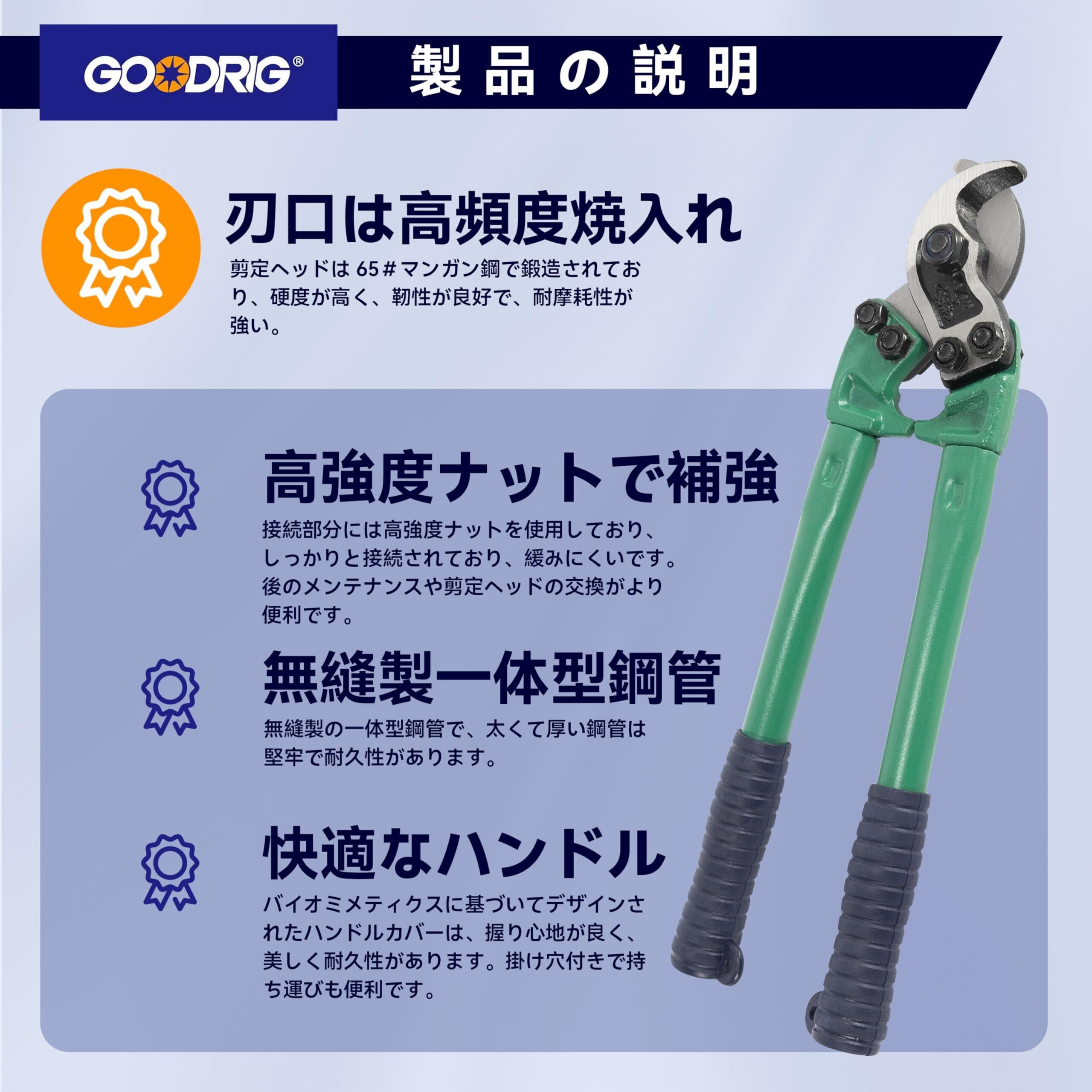 【製品仕様】100sq mmのケーブルを簡単に切断可能。 【優れた材質】高規格の65マンガン鋼を使用し、金属表面は滑らかで光沢があり、長時間使用しても鋭さを保ちます。 【優れたデザイン】ダブルブレード設計により、使用時にスムーズに切断でき、切り口が平整です。ハンドルは指を挟みにくいV字型デザインを採用しており、安全で使いやすいです。さらに、ハンドルには滑り止め素材を使用しており、安全性を一層高めています。 【切れ味の硬度】50-60HRC。