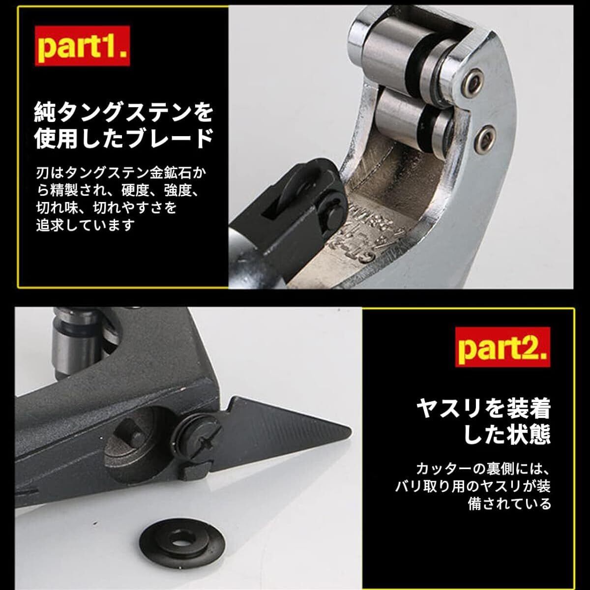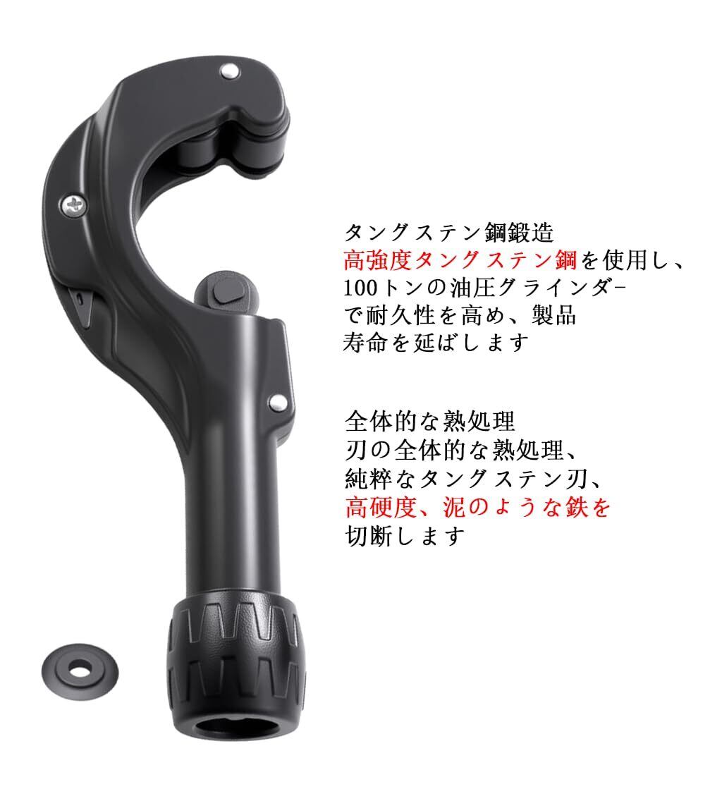 【幅広い切断対応・高精度設計】 対応直径:黒モデル 0.1~1.4インチ(3~35mm)、最大肉厚:0.1インチ(3mm)。薄肉ステンレス管(1.2mm以下)にも対応。銅管、アルミ管、ステンレス管、PVCパイプなど様々な素材に対応可能。高炭素鋼製刃(PSB-7付属)により、スムーズで綺麗な切断が可能。ベアリングローラー付きで滑りを防ぎ、正確な円形切断を実現します。単管パイプやイレクターパイプの切断にも対応し、幅広い用途に活躍。