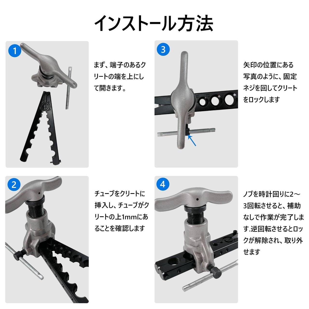 【利用可能なサイズ】:フレアツール用の12つのダイスサイズ。1/4"、5/16"、3/8"、1/2"、5/8"、3/4"と6,9,10,12,16,19のサイズです。