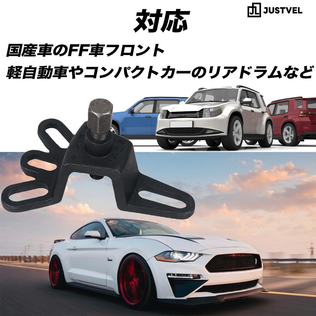 【固着したハブやドラムを自らの手で。スライドハンマー不要のDIY用コンパクトハブプーラー】これまで「プロの領域」だと諦めていたハブベアリングの交換やドラムブレーキの分解。その最大の難関である「固着したハブ・ドラムの抜き取り」を、高価で大型なスライドハンマーを使わずに自宅ガレージで可能にする特殊工具(SST)です。 【軽自動車から普通車まで。国産車の多くに適合する、4穴・5穴兼用プレート】プレートのスリット(溝)をハブボルトに合わせることで、PCD100〜114.3mmの一般的な国産車に多い4穴・5穴ハブに幅広く対応。このハブプーラーがあれば、ご自身の車はもちろんご家族や友人の車の足回り整備まで活躍の場が広がります。 【静かに力強く。理にかなった「押し出す」力】使い方はお車のハブボルトにプレートを装着しセンターボルトを締め込んでいくだけ。インパクトレンチのような衝撃やスライドハンマーのような反動を伴うことなく、センターボルトがじわじわとドライブシャフトを押し出し、固着したハブを確実に抜き取ります。 【巨大な力に耐える強靭な熱処理済みボディ】ハブを引き抜く際に掛かる強大な力に耐えうるよう、ハブプーラー本体は熱処理を施した高耐久スチール製。DIY用途には十分すぎるほどの強度を確保しており、一度購入すれば長くあなたのガレージライフの頼れる相棒となります。 【仕様および、ご使用上の重要事項】■適合:4穴・5穴ハブ(PCD100~114.3mm目安)、ハブボルト径12mmまで ■重量:約900g ■重要:ご使用の際は焼き付き防止のため必ずセンターボルトのネジ山にグリスや潤滑油を塗布してください。 ■注意:本製品は実用工具です。性能に影響のない、製造・輸送時の細かな傷や、軽微なバリなどがある場合がございます。あらかじめご了承ください。 【当ブランドオリジナルパッケージで発送】日本ブランド「JUSTVEL」が印字されたオリジナルパッケージに包んでお客様の元へ大切にお届け致します。