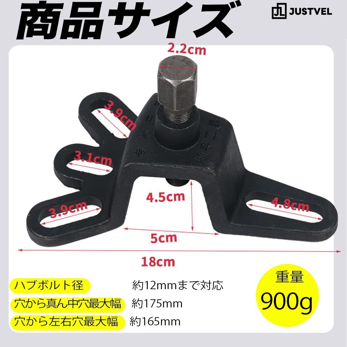 【仕様および、ご使用上の重要事項】■適合:4穴・5穴ハブ(PCD100~114.3mm目安)、ハブボルト径12mmまで ■重量:約900g ■重要:ご使用の際は焼き付き防止のため必ずセンターボルトのネジ山にグリスや潤滑油を塗布してください。 ■注意:本製品は実用工具です。性能に影響のない、製造・輸送時の細かな傷や、軽微なバリなどがある場合がございます。あらかじめご了承ください。