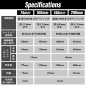 ・作動範囲は直径や深さごとに定められており、75mmタイプは直径46mmまで、200mmタイプは深さ115mmまで対応。さらにボルトを使わずにタイラップを使用することで直径を広げられる場合もあり、実作業に合わせた柔軟な使い分けが可能です。※詳細は商品仕様欄をご確認ください。