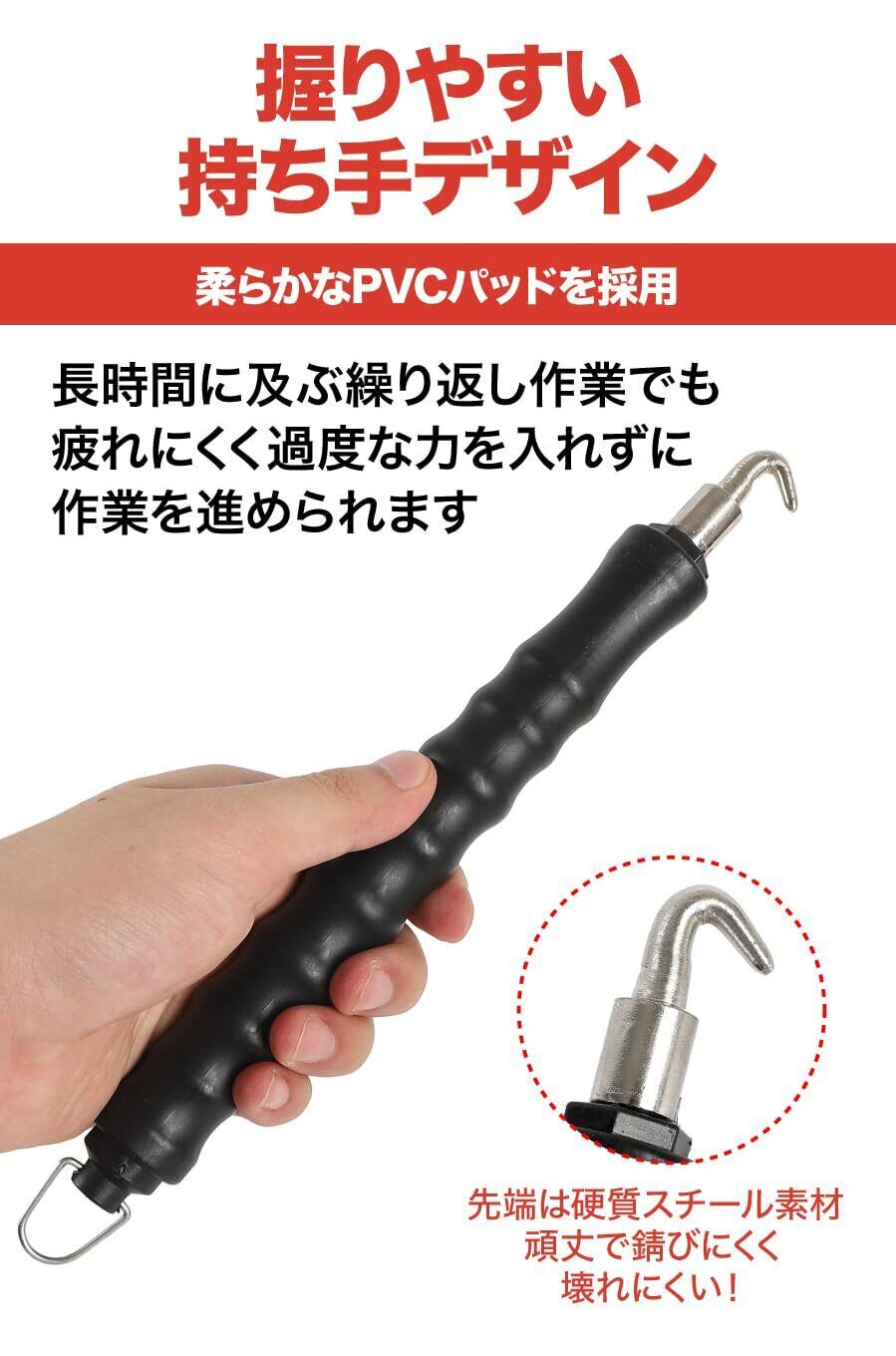 【ワイヤーを楽に結ぶ】ワイヤーにフックを掛けて引っ張るだけで結束が出来る鉄筋ハッカー。初めての使用でもコツ要らずで扱いやすく、現場の作業時間短縮と負担を軽減。半自動でしっかりと結べます。