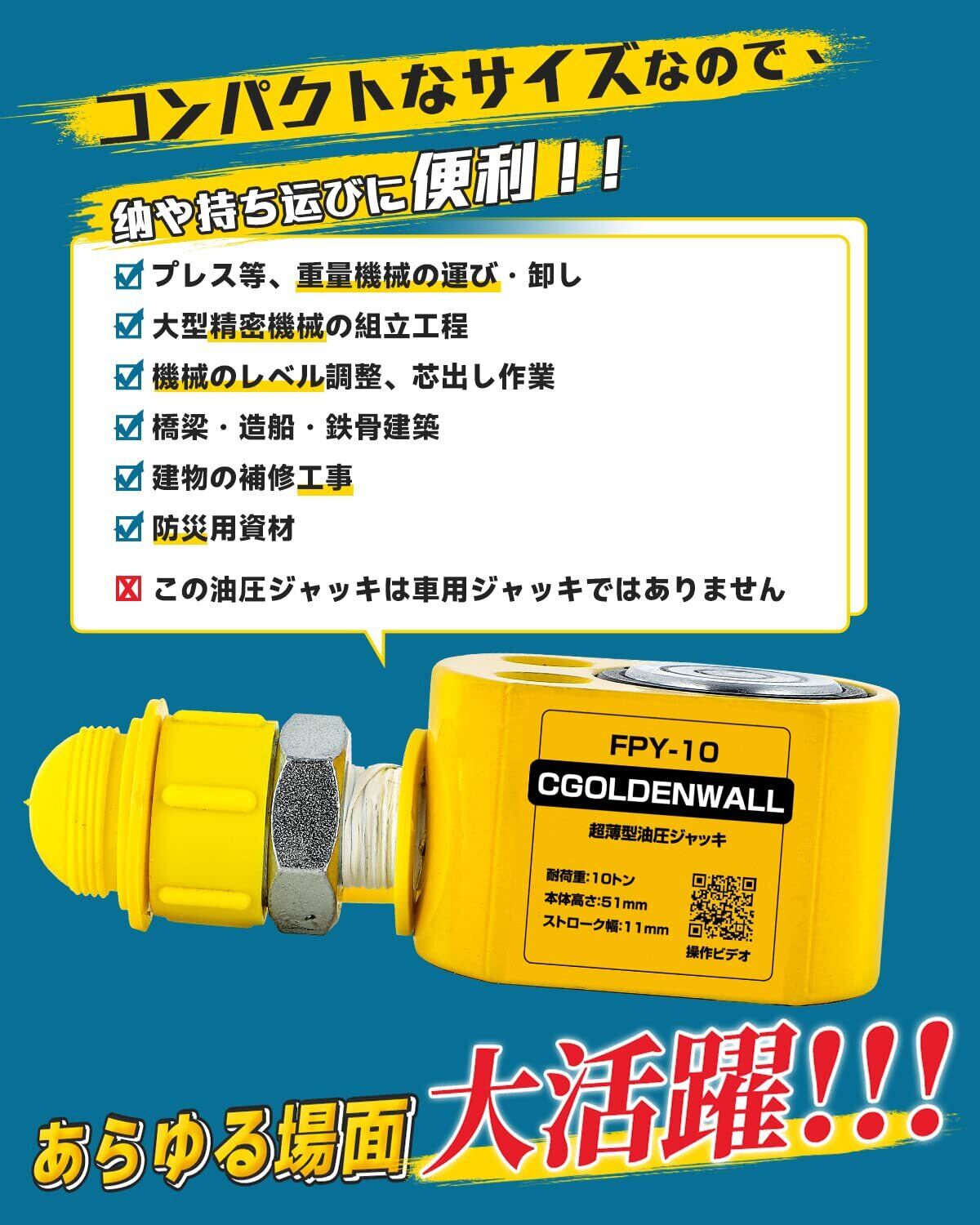 【新着商品】CGOLDENWALL 油圧ジャッキ小型 耐荷重5t、10t、20t、30t、50t、100t、150t狭いスペースの持ち上げ作業に最適 (10トン+ポンプ)