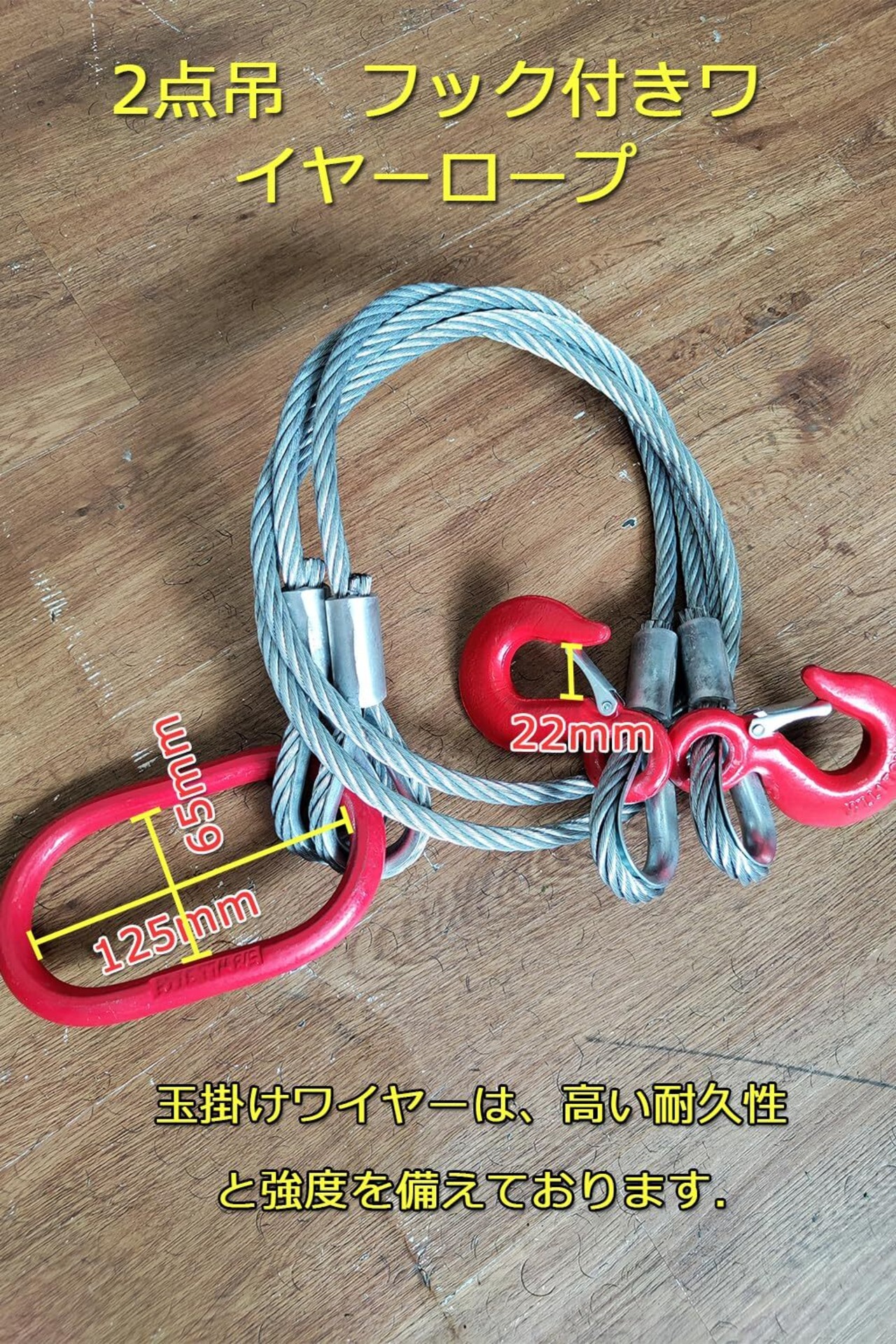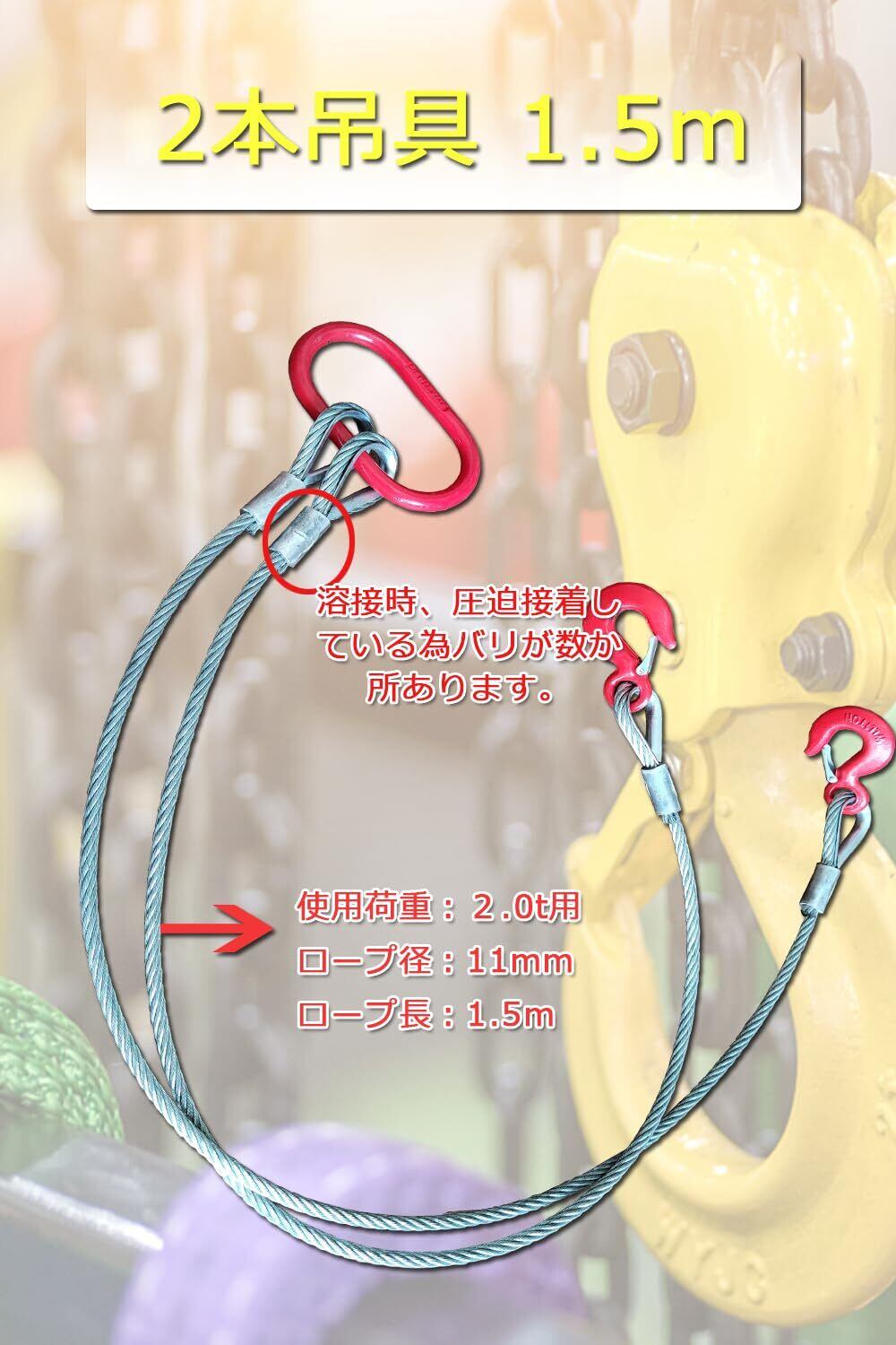 【2点吊りワイヤー】定格荷重…2000kg 本体重量…3kgロープ長…1.5m ワイヤー径…11mm フック口開き…22mm