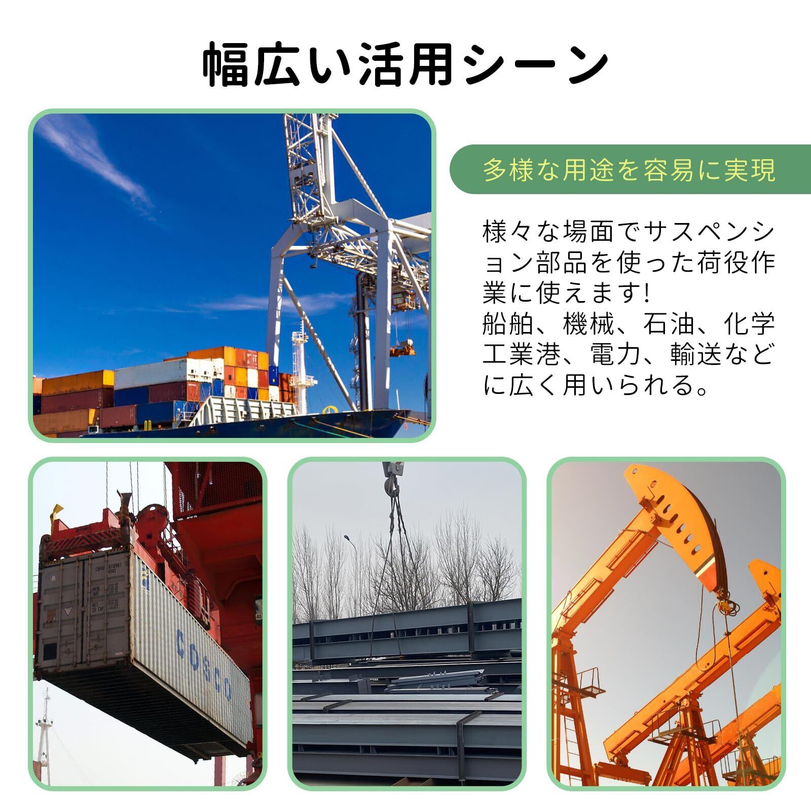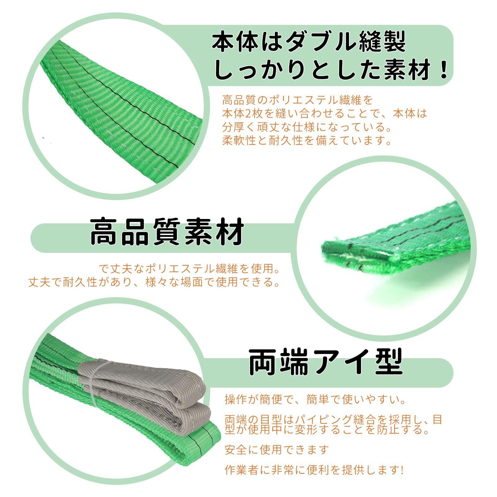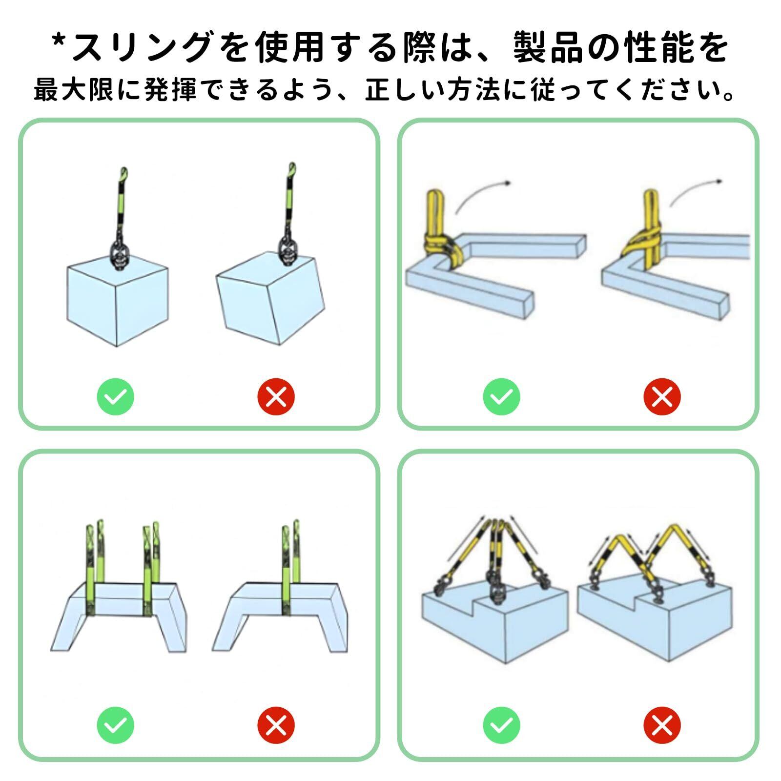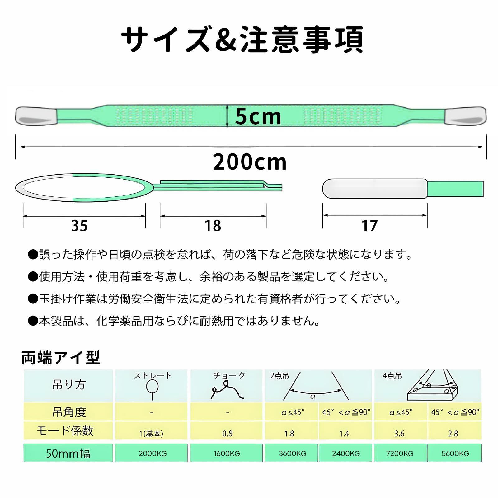 【安心の】ヒント:上記各最大使用荷重を超える吊り荷は絶対に吊らないようにお願いいたします。使用時は吊り上げ物の角にパッドなどを必ず当ててご使用ください。製品はスタートだけで、サービスは無限です。私たちは製品を販売するだけでなく、良質な販売前、アフターサービスを提供することにも力を入れています。ご購入日から30日以内にご連絡いただければ、どんな理由であっても返金・交換に応じます。不良品・ご不満の場合またはご使用上何かご不明なところがございましたら、お気軽にお問い合わせください。連絡方法:注文履歴より販売元にご連絡ください。