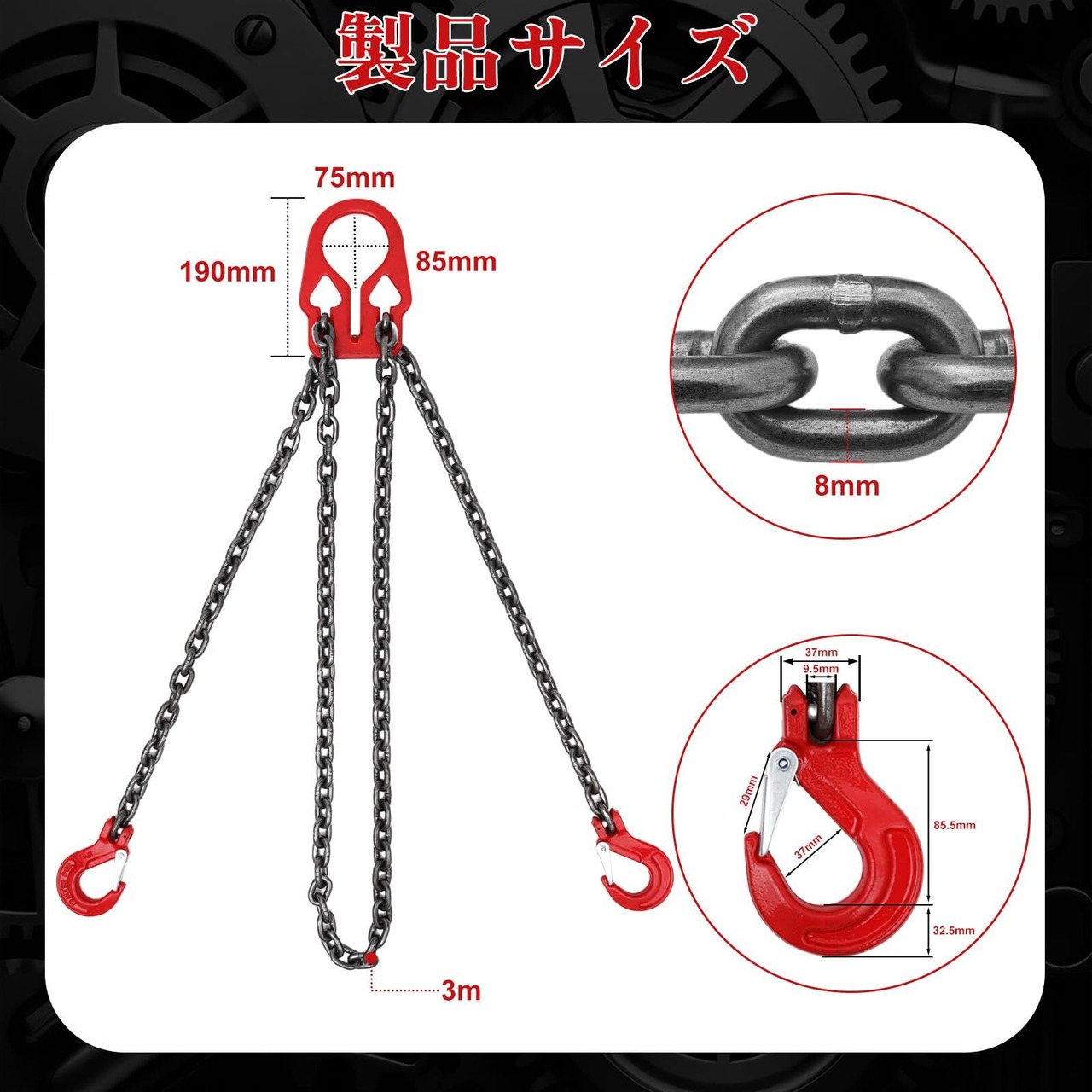 製品仕様:フック数 2 定格荷重 3.18トン チェーン長 3 m チェーン径 8 mm