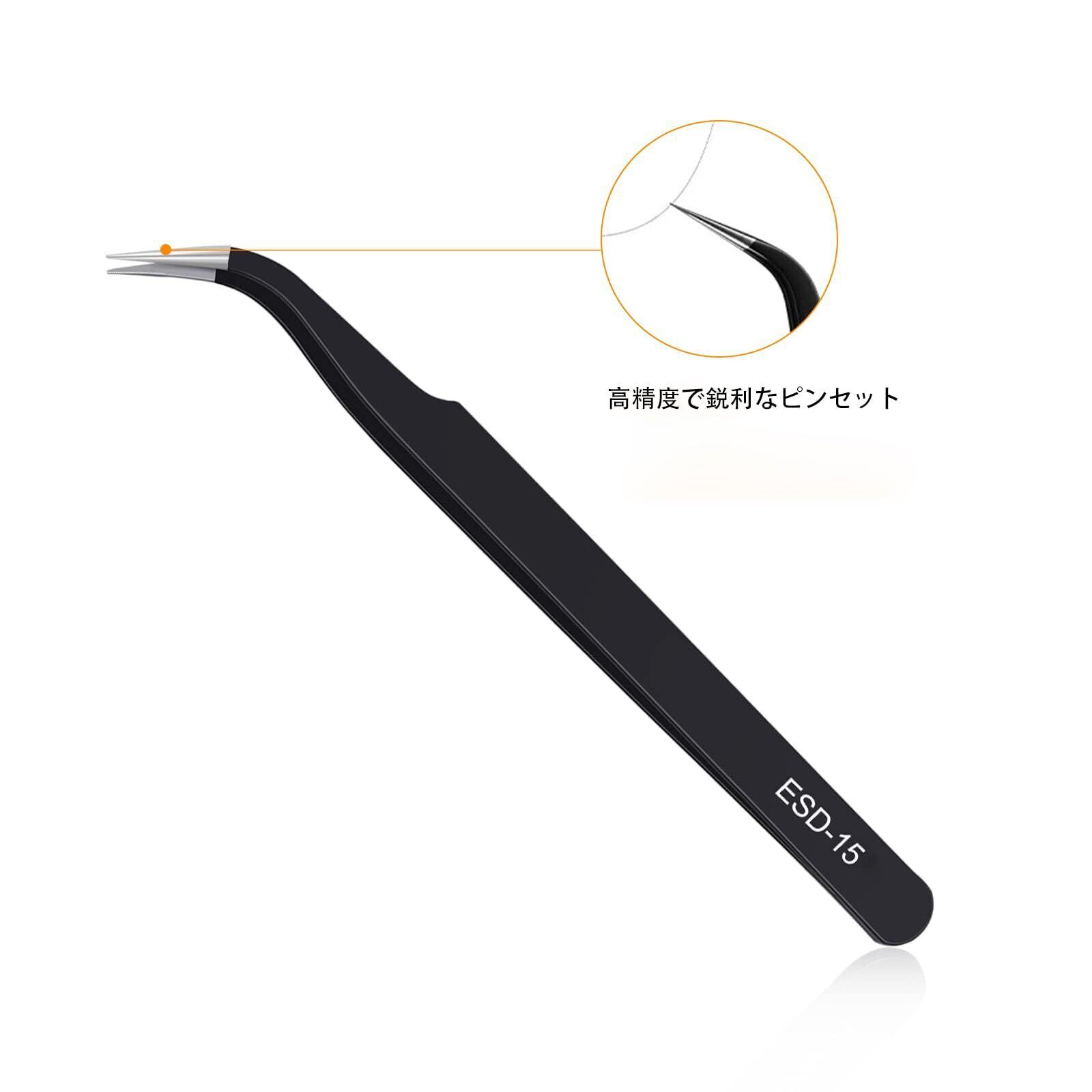 ピンセット[ESD-15]:先曲タイプ、狭い場所での作業に使える(124mm/4.88in)。