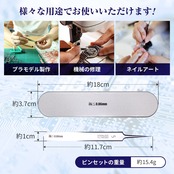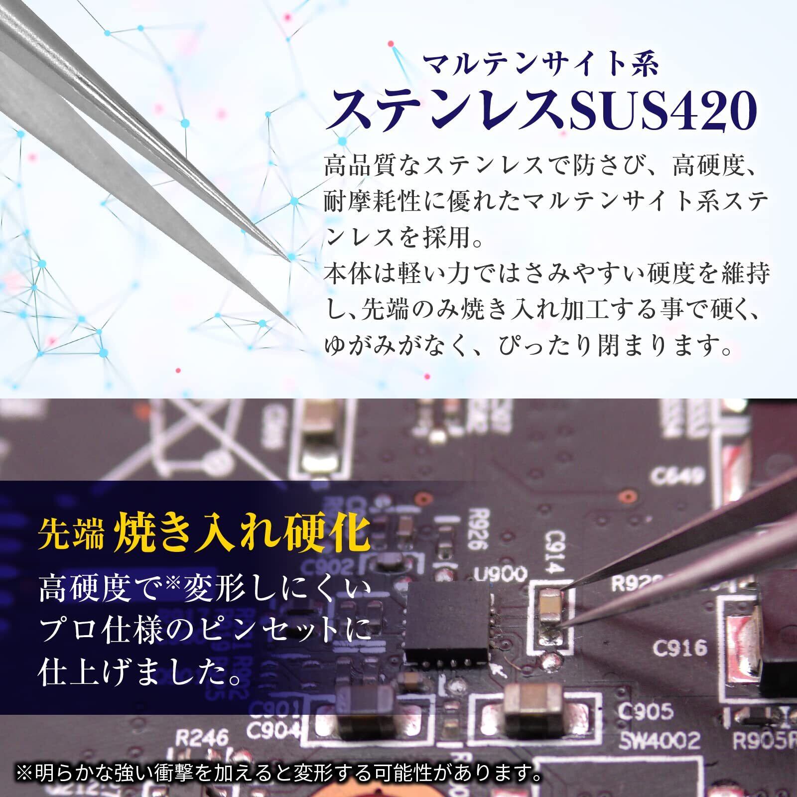 [高品質ステンレス採用!] マルテンサイト系ステンレスを採用し他金属よりも耐食性、耐熱性、耐酸化性に優れています。ピンセット先端を焼き入れ加工することにより硬度が増し、軽い力でしっかり掴めます。(先端をよく見ると先端に焼き入れ硬化の跡がございます。)