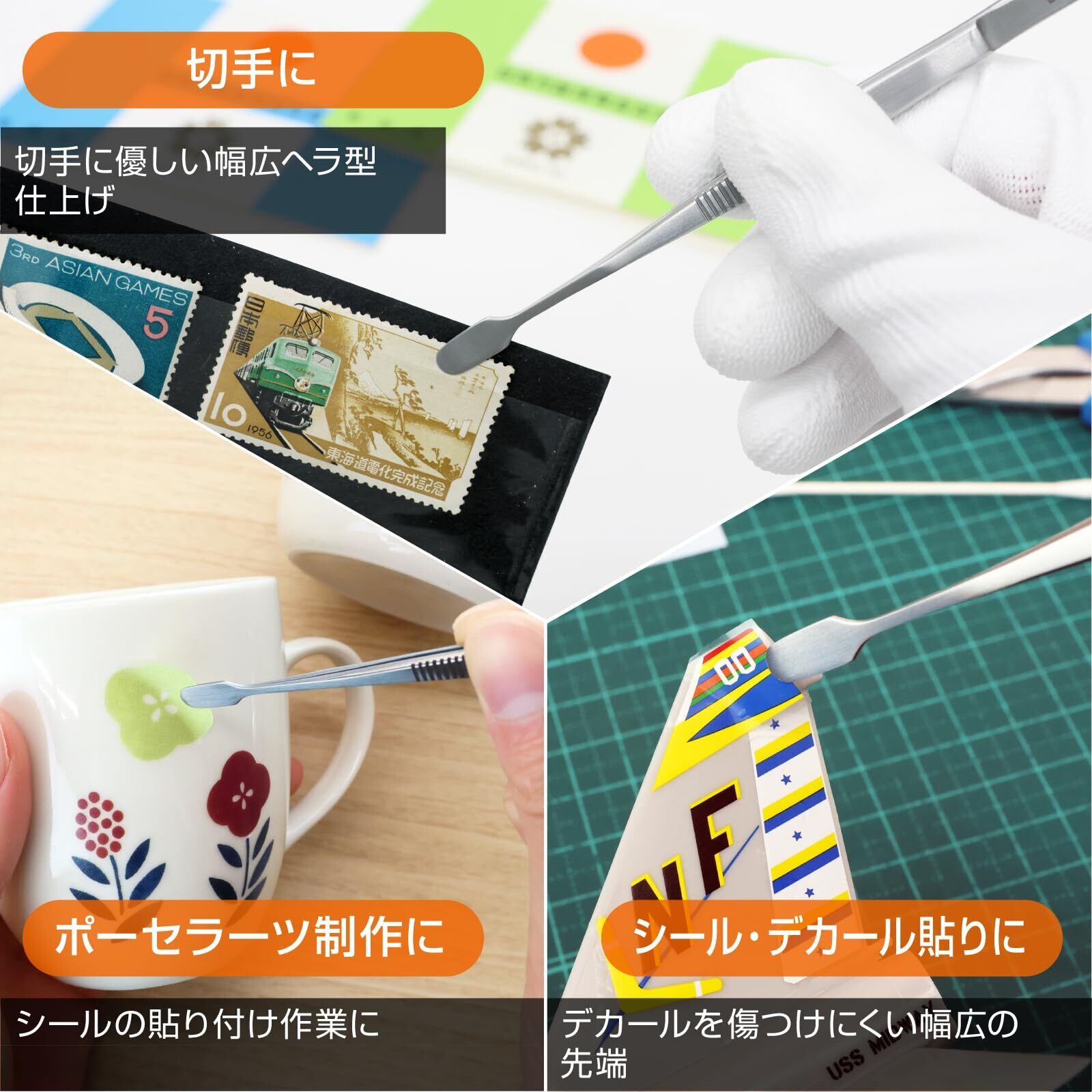 切手収集や写真整理などのコレクション用途に加え、工作・ネイルアート・模型製作・ポーセラーツ・水転写デカール・園芸など、あらゆる分野で活躍します。小さな部品の交換やフィルムの貼り付け、細かい装飾作業にも対応できる万能設計。プロフェッショナルから趣味のクリエイターまで、幅広いユーザーに信頼される一本です。