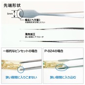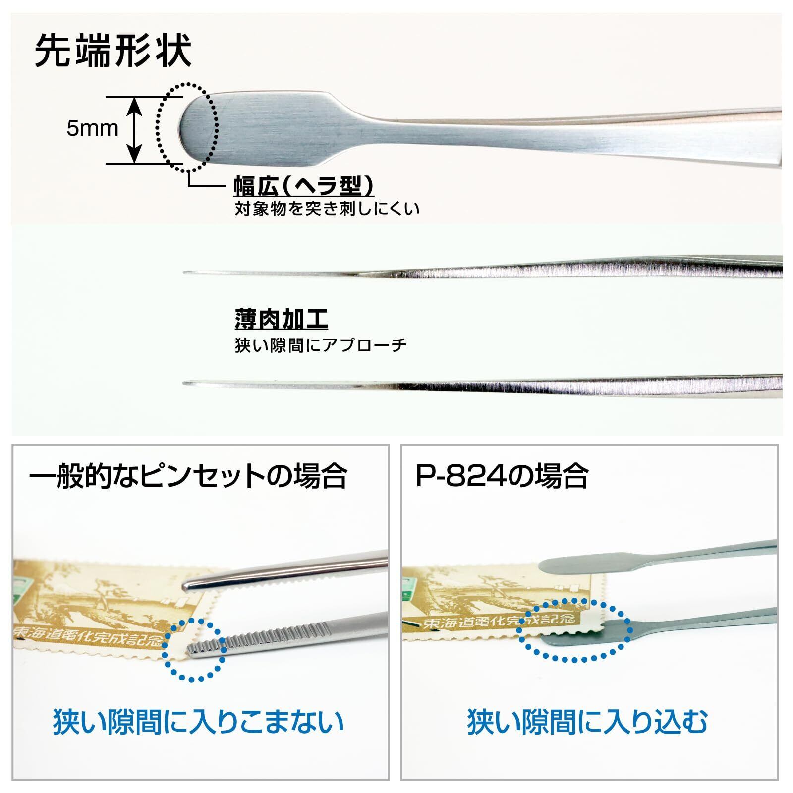 P-824は、先端が幅広いヘラ型に設計された精密ピンセットです。紙やフィルムなどの薄い素材を傷つけずに扱えるよう、先端のエッジをなめらかに仕上げています。切手や写真などのコレクション整理時にも、対象を突き破る心配がなく、優しく確実に保持可能。繊細な紙素材を安全に扱えるため、切手コレクターや紙を扱うプロフェッショナルに最適な一本です。