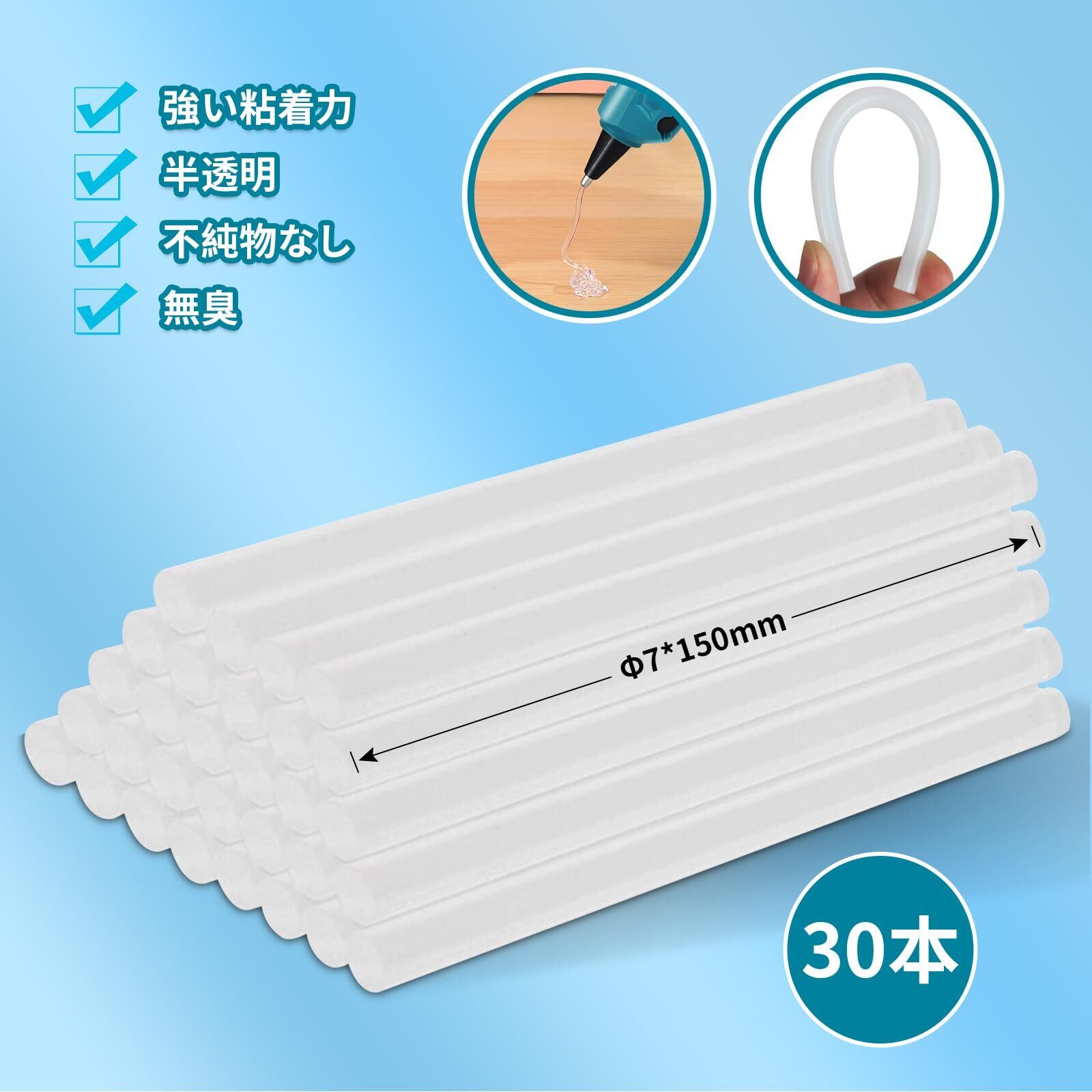 【接着効率が30%アップ】付属品にはスティック 30 本が含まれますグルーガン スティック 強力。グルーガンスティック スティックはすべてEVA素材を採用し、接着効率が30%アップします。ホットグルーガンの最高温度は約150°です。 新しい強力な接着剤なので、接着力はそのままに、環境にやさしく無臭です。 半透明で目立たないので、金属、木材、布、プラスチック、セラミック、その他の色の付いた素材を互いに接着できます