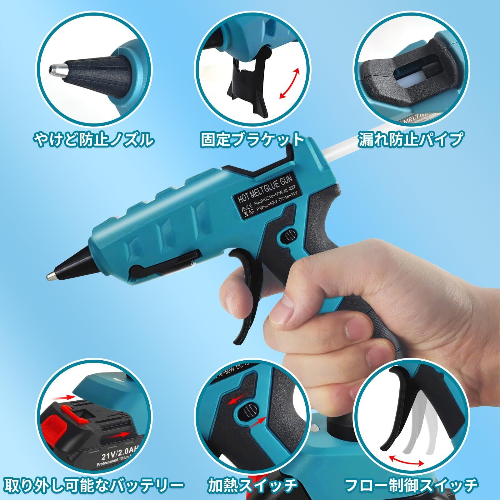 【18-21Vバッテリーに対応】 グルーガン コードレス充電式 主流の18V-21Vリチウムイオン電池に適しています (ご注意:本体のみご用意しております。別途バッテリーと充電器をご購入ください)