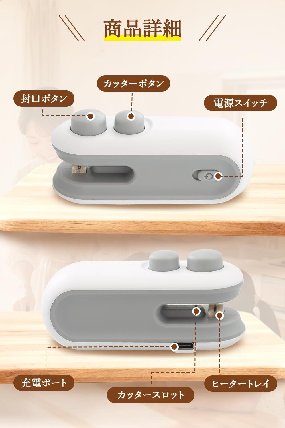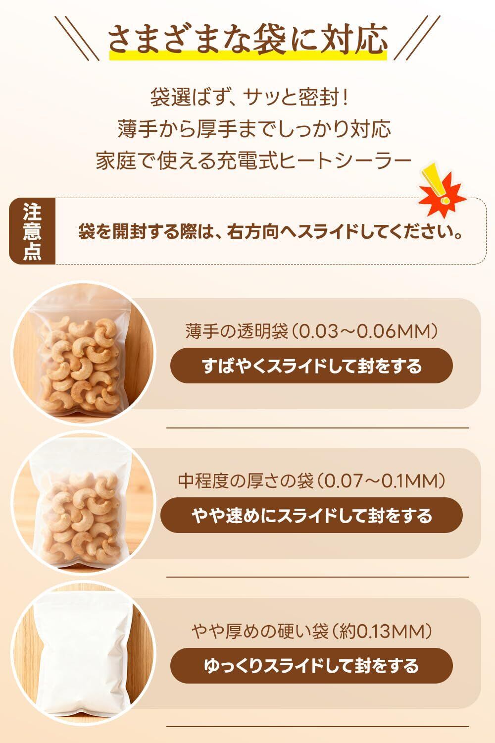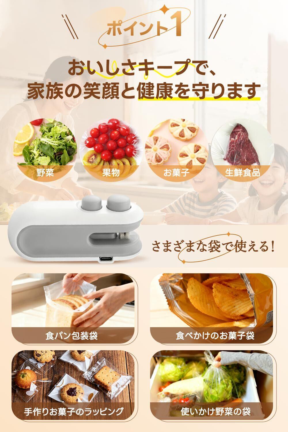【多用途対応!さまざまな袋に使える】野菜・果物・お菓子・パン・生鮮食品など、さまざまな袋に対応する万能シーラー。食パン包装袋・使いかけ野菜の袋・手作りスイーツのラッピング袋などにも最適です。 家族の笑顔と健康を守るキッチンアイテム。