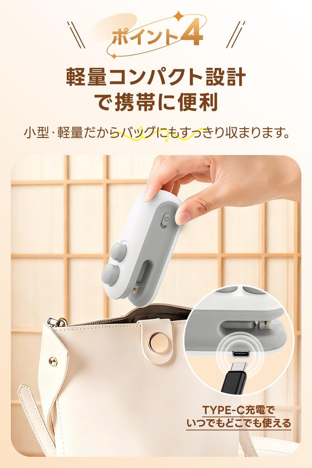 【USB Type-C充電式でコードレス使用可能】面倒な電池交換は不要!USB Type-Cケーブル充電対応で、フル充電すればどこでも使えるコードレス仕様。キッチン・リビング・車内・旅行先など、場所を選ばず手軽に食品を密封できます。