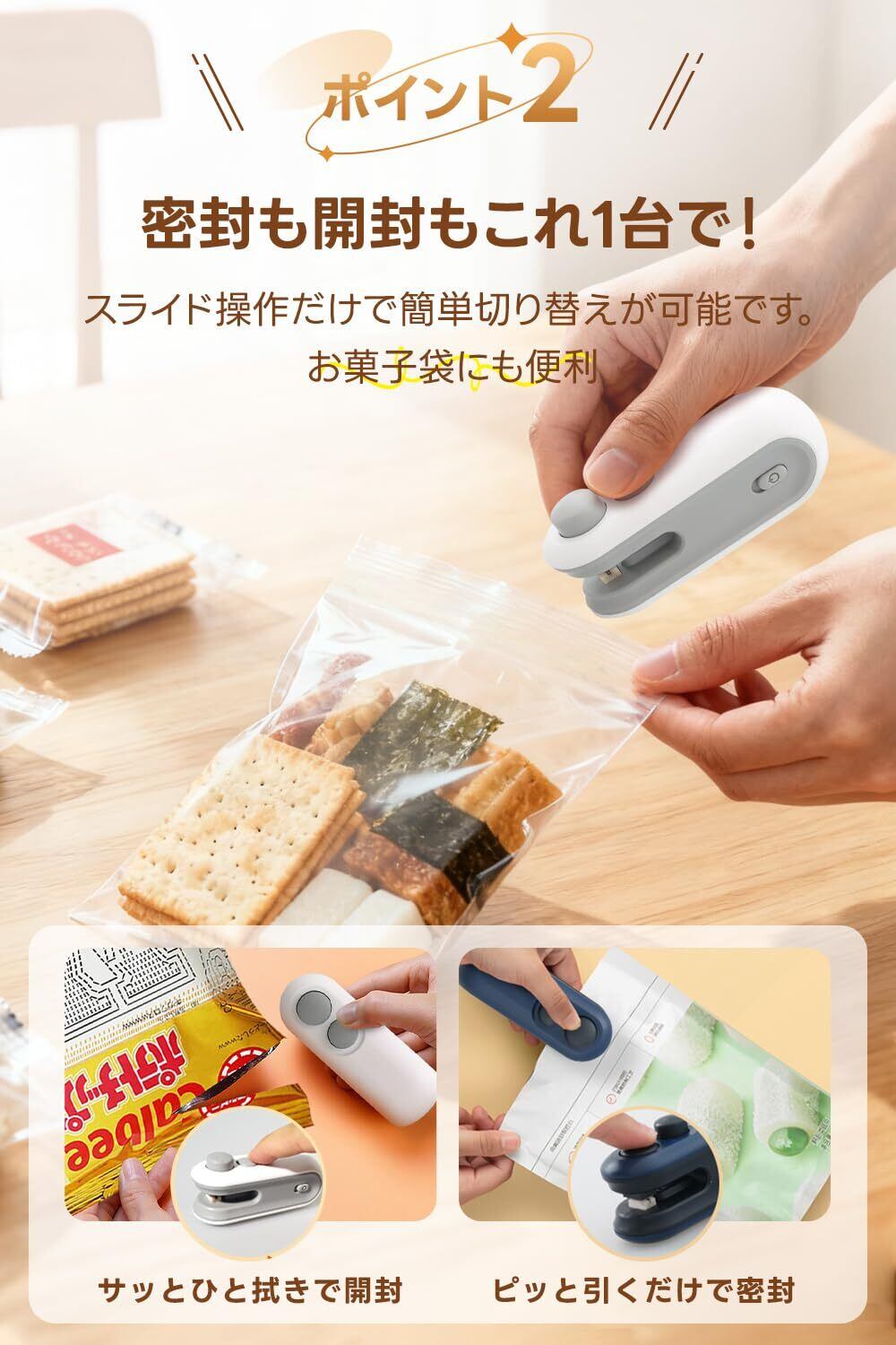 【これ1台で密封も開封もOK!2in1ヒートシーラー】PACEINのヒートシーラーは密封と開封がどちらもできる2in1設計。スライド操作だけで簡単に切り替えが可能。お菓子袋や食品保存袋を素早く密閉・開封でき、食品の鮮度をしっかりキープします。